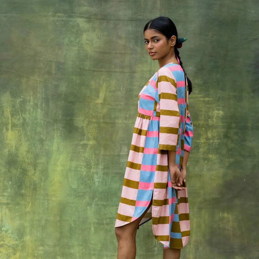 Button down tunic with side and back gather. Fitted chest with flared bottom. It can be styled as a dress or a tunic. Tunic comes with Inseam pockets.