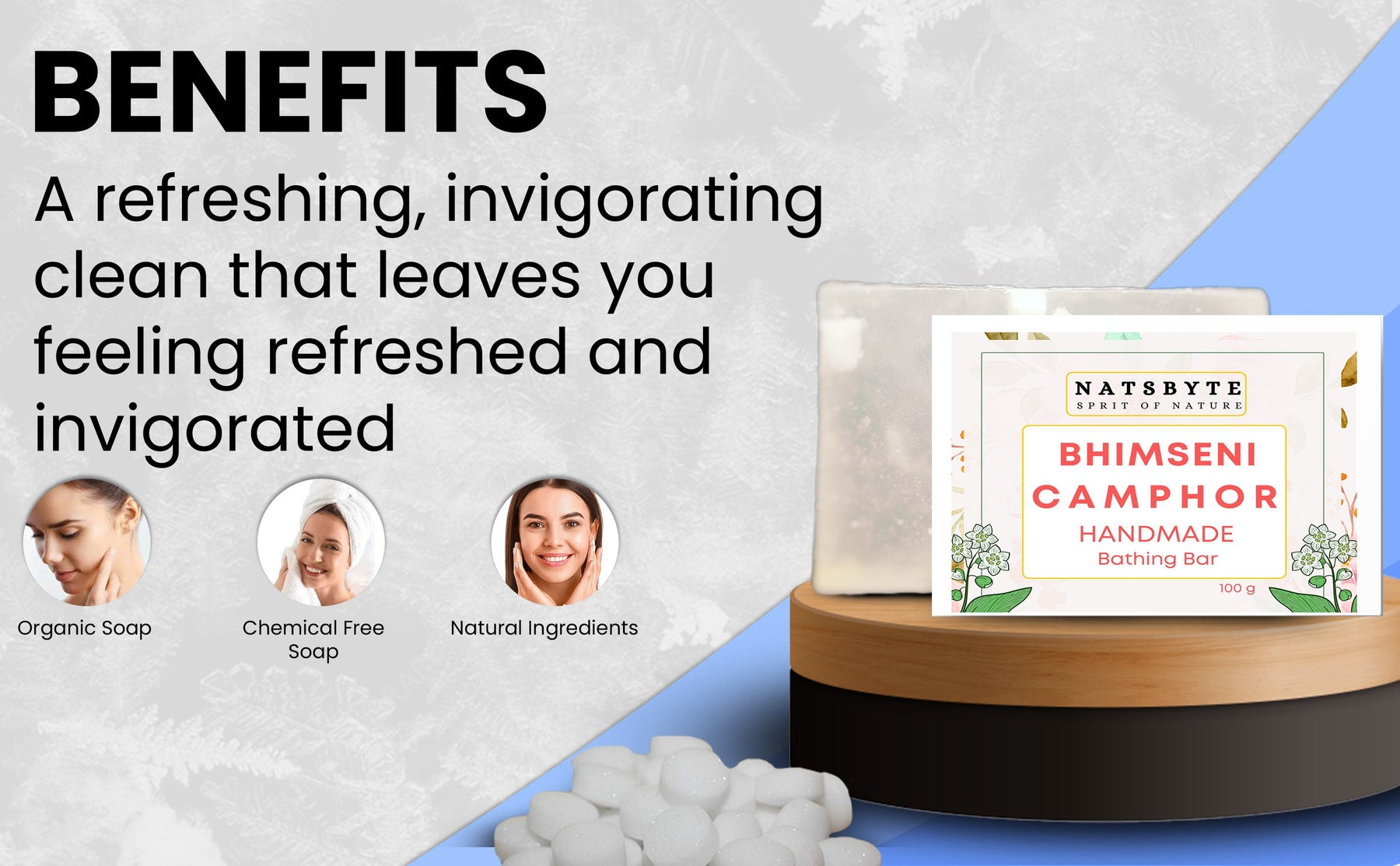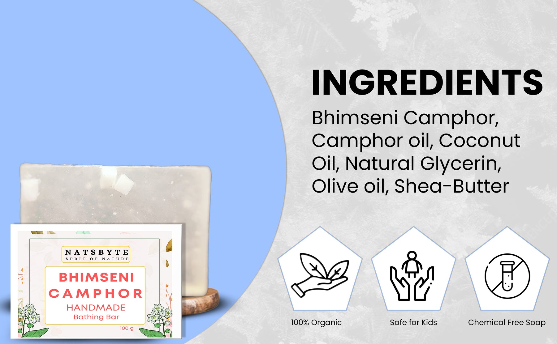 Natsbyte Brings Pure & Natural Handmade Camphor Soap Description of Handmade Soap Also known as “handmade soap” or “homemade soap”, handcrafted soap is a blend of both science and art. By combining the scientific knowledge of the last 150 years and the artistic creativity of the soapmaker, each bar is safe, luxurious and unique. There are several types of handcrafted soap. Benefits of Handmade Soap (Made with Natural Ingredients) It made without chemicals and synthetics. … It’s not harmful to waterways. … It moisturizes your hands better and longer with glycerin. … It’s palm oil-free or only contains sustainably-harvested palm oil. … It’s often vegan and not tested on animals. Ingredients : Bhimseni Camphor, Camphor oil, Coconut Oil, Natural Glycerin, Olive oil, Shea-Butter Direction for use: Massage the soap all over body in a circular motion, then rinse throughly with water. Safety Information: Caution : Natural Product also can be allergic to some people. Test patch on inner elbow and leave it for 10 min. Discontinue if irriatation.