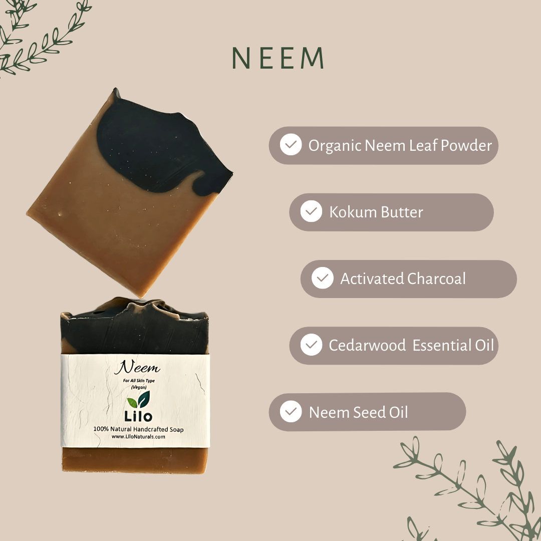 Ingredients: Organic Neem Leaf Powder, Kokum Butter, Activated Charcoal, Peppermint and Cedarwood Essential Oils, Saponified Cold Pressed Neem Seed, Castor, Coconut, Rice Bran and Sunflower Oils, Sea Salt.
