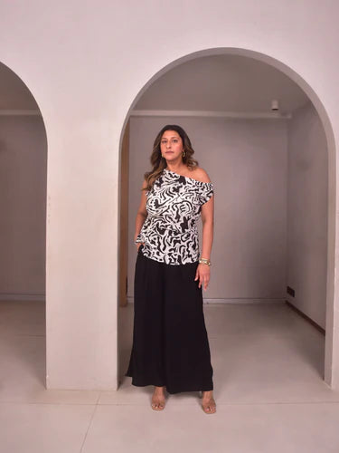 This asymmetric top in hand-screen-printed black and white modal cotton features pleats on the shoulder and side to beautifully contour the waist. Perfect for evening outings or stylish vacations, it blends statement design with comfort. Pair it with black flared pants and bold earrings for a chic, modern look.