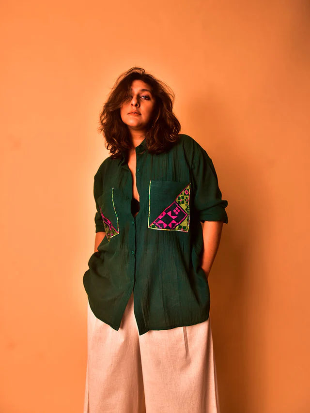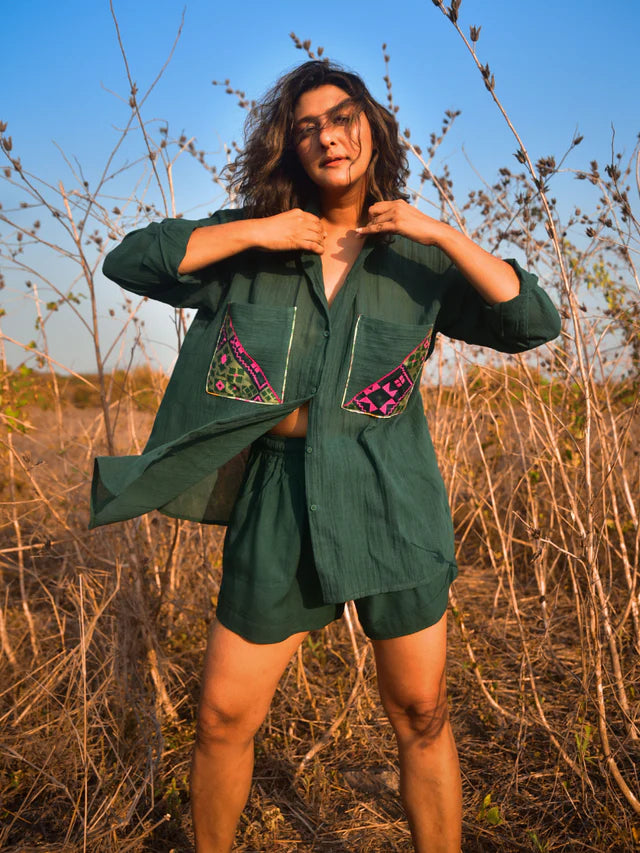 Rock the co-ords like Aditi! These deep green co-ords are cut in dyed cotton. An oversized shirt has contrast pockets in the front (the print may vary based on availability). Paired with co-ordinated deep green shorts with an elasticated waist, drawstring tie-up and pockets on both sides