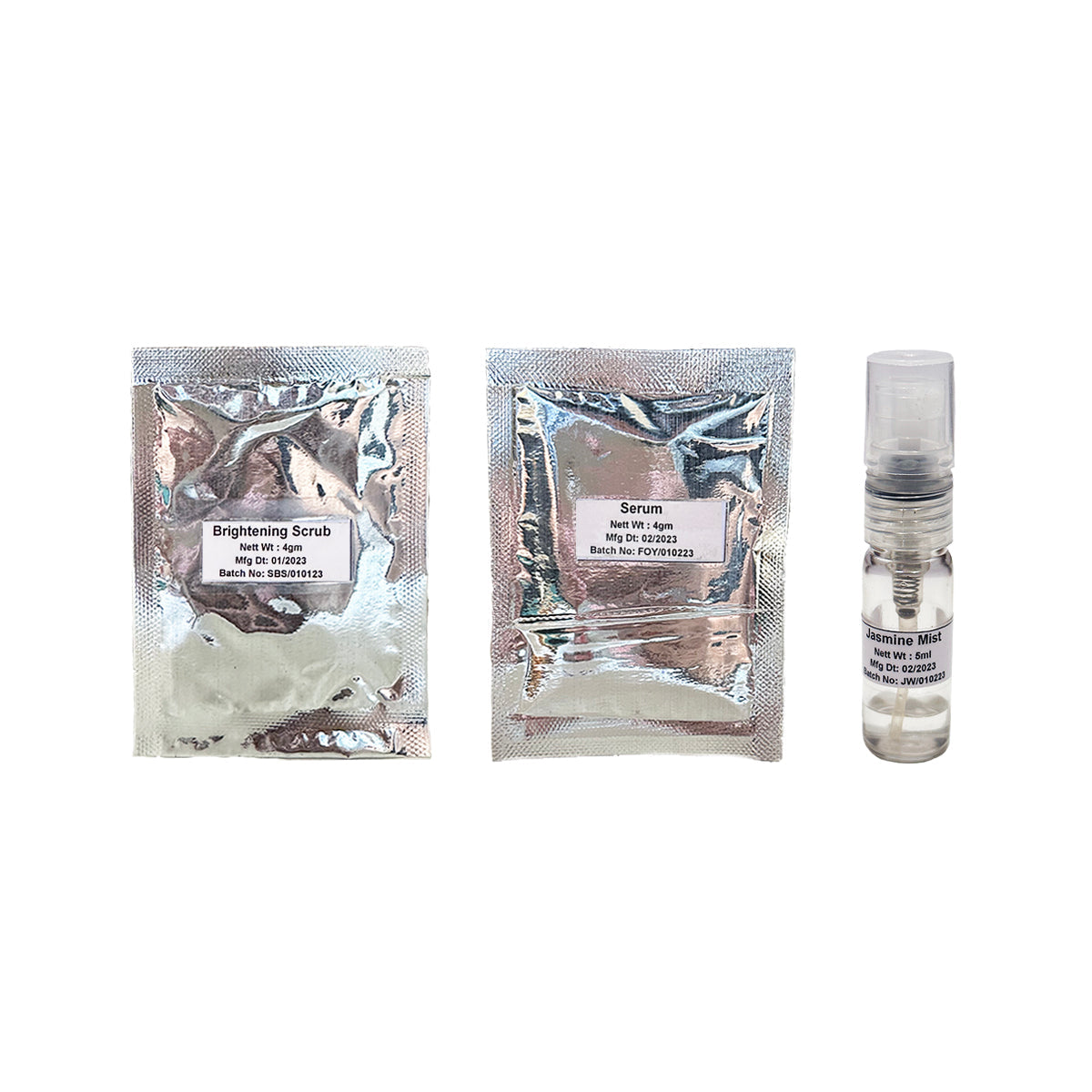 Ingredients:Brightening Scrub: Pumice, Shankh Bhasma, Moringa, Walnut Granules, Apricot, vanilla, Coconut and Jojoba blended with Vitamins. Jasmine Face Mist: Aqua(water), Mogra, jasmine and Juhi. Lavender Chamomile Face Serum: Aloe Vera, Chamomile, Geranium, Spikenard and Fresh Lavender.