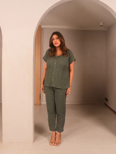 Crafted in our exclusive dark green gauze, this easy-fit shirt features an elasticated neckline for subtle gathers, short sleeves, and a clean button-down front. Pair it with our matching narrow pants for a coordinated, comfort-first look. Layer under a vest or tuck into a skirt for versatile styling. Ideal for creative office spaces or informal work catch-ups.