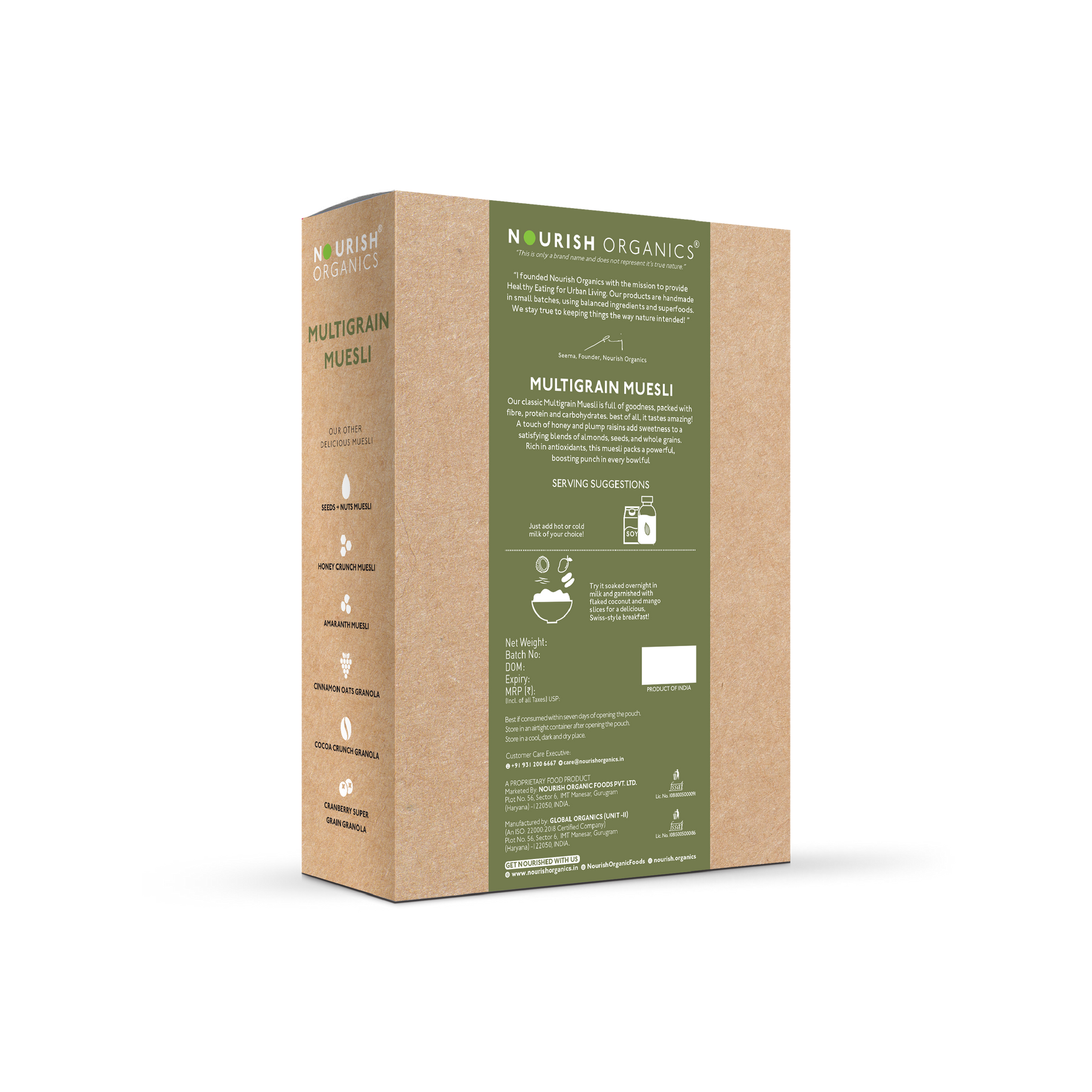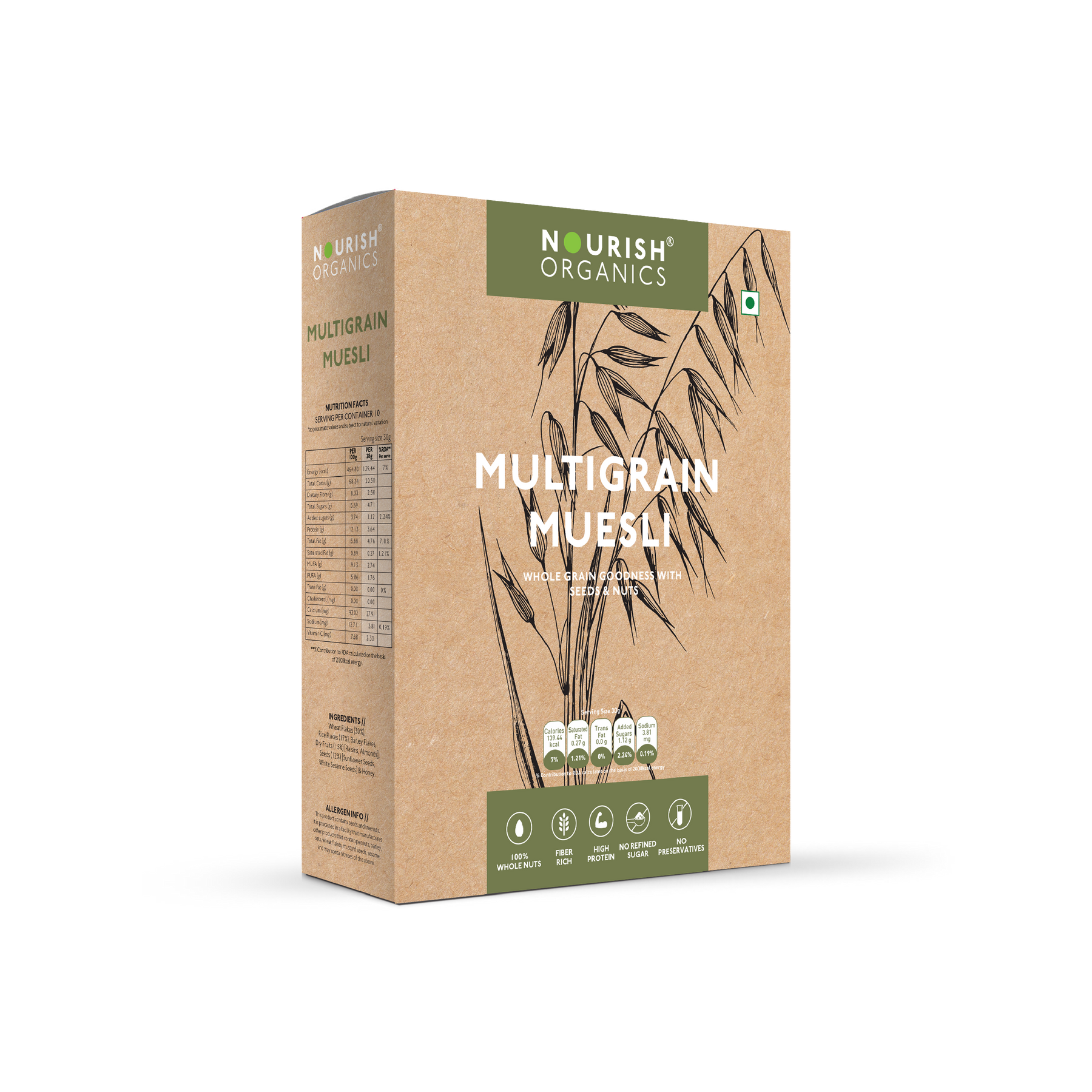 Our Multigrain Muesli is full of natural goodness, packed with fiber, protein, healthy fats, and carbohydrates. Best of all, it tastes amazing! A touch of honey and plump raisins add sweetness to a satisfying blend of almonds, walnuts, seeds, and whole grains. Rich in antioxidants, this multigrain cereal packs a powerful, health-boosting punch in every bowlful. Try it soaked overnight in milk and garnished with flaked coconut and mango slices for a delicious, Swiss-style breakfast!