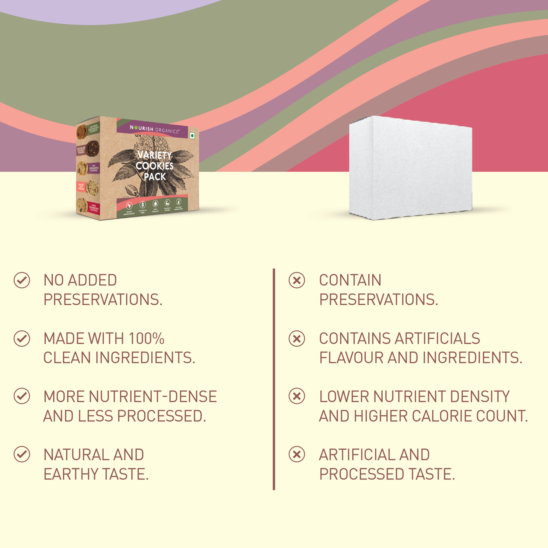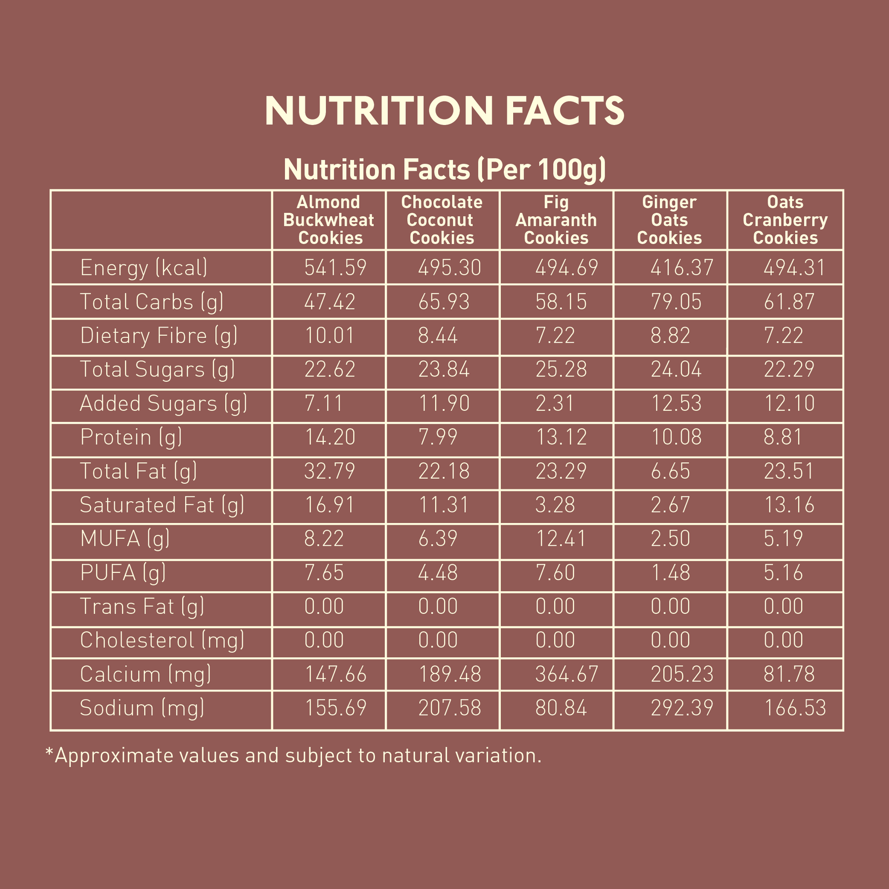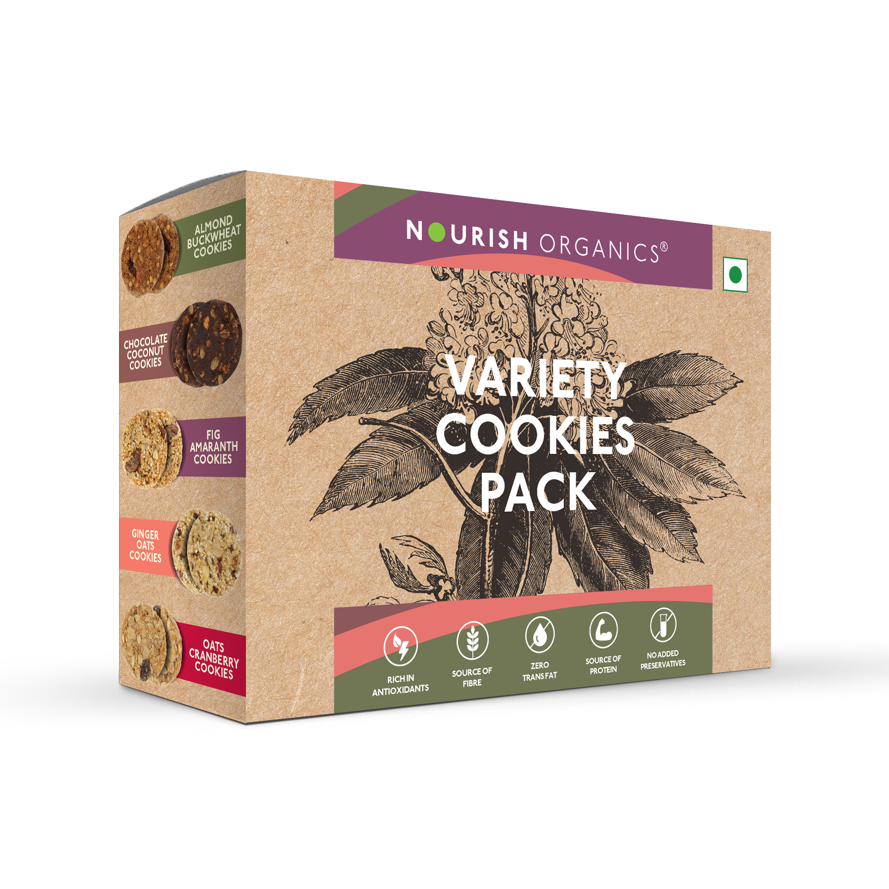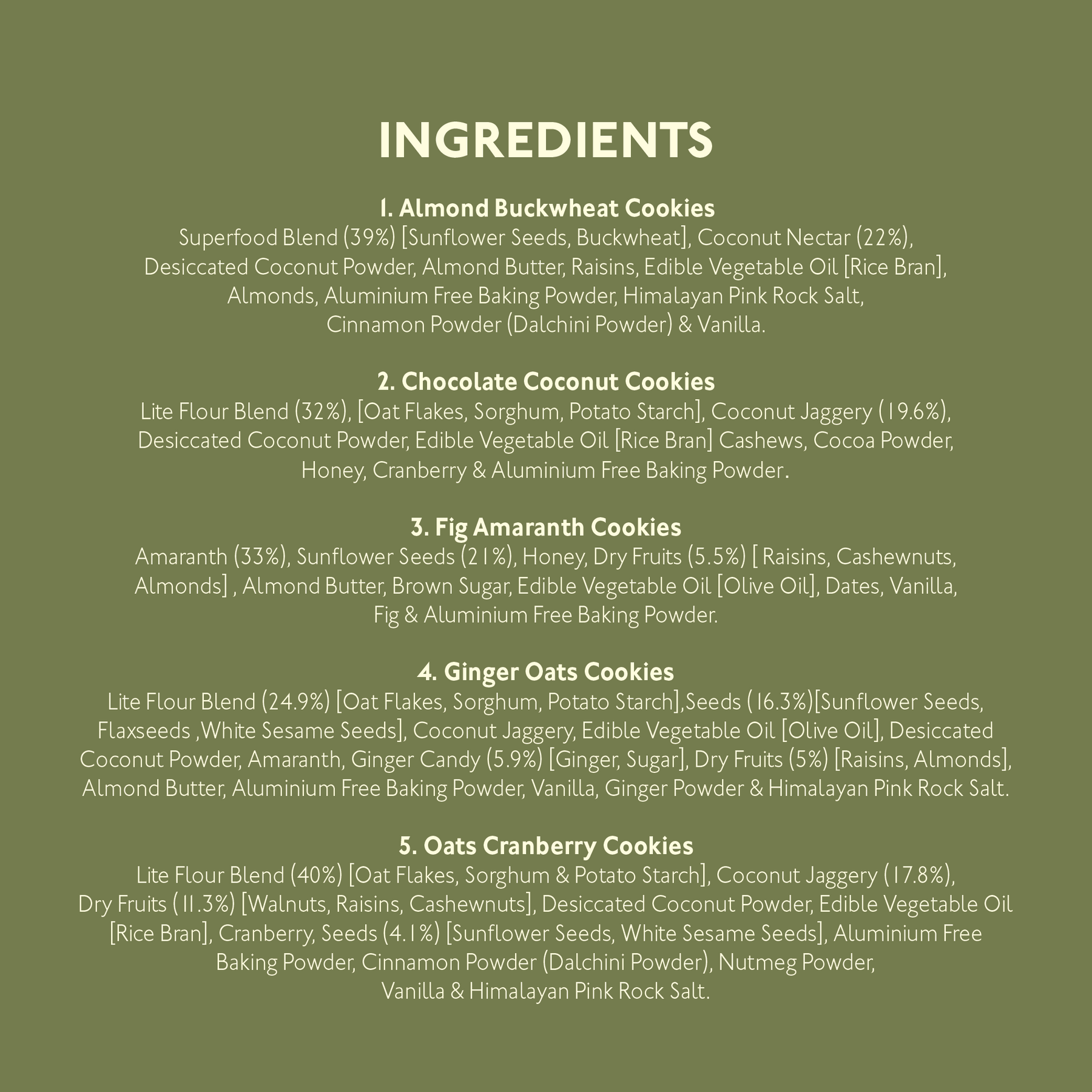 The only Cookie box you need to taste all our wholesome, nutritious, and yummy cookies in one go. Our Variety Cookies pack contains Almond Buckwheat Cookies, Chocolate Coconut Cookies, Fig Amaranth Cookies, Ginger Oats Cookies and Oats Cranberry Cookies.