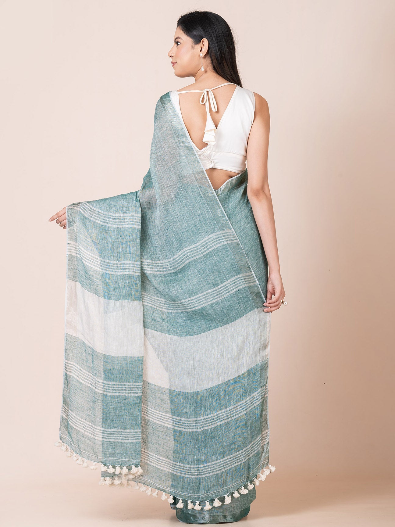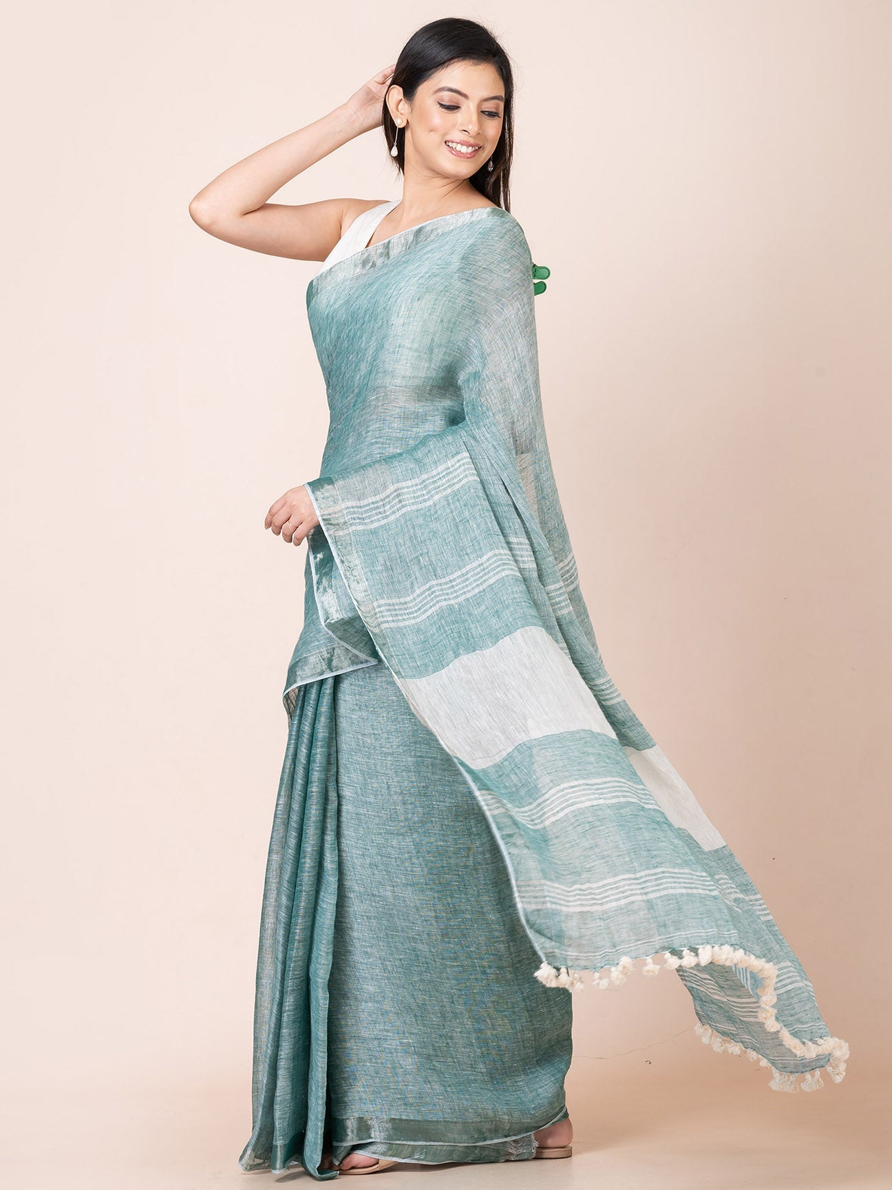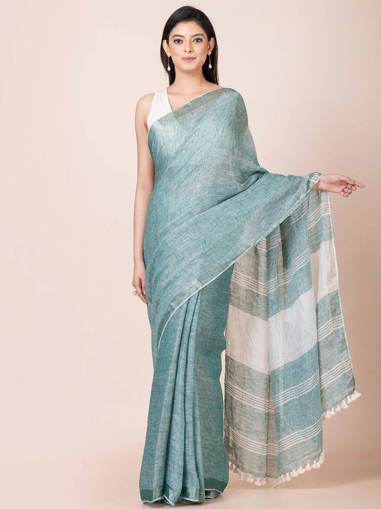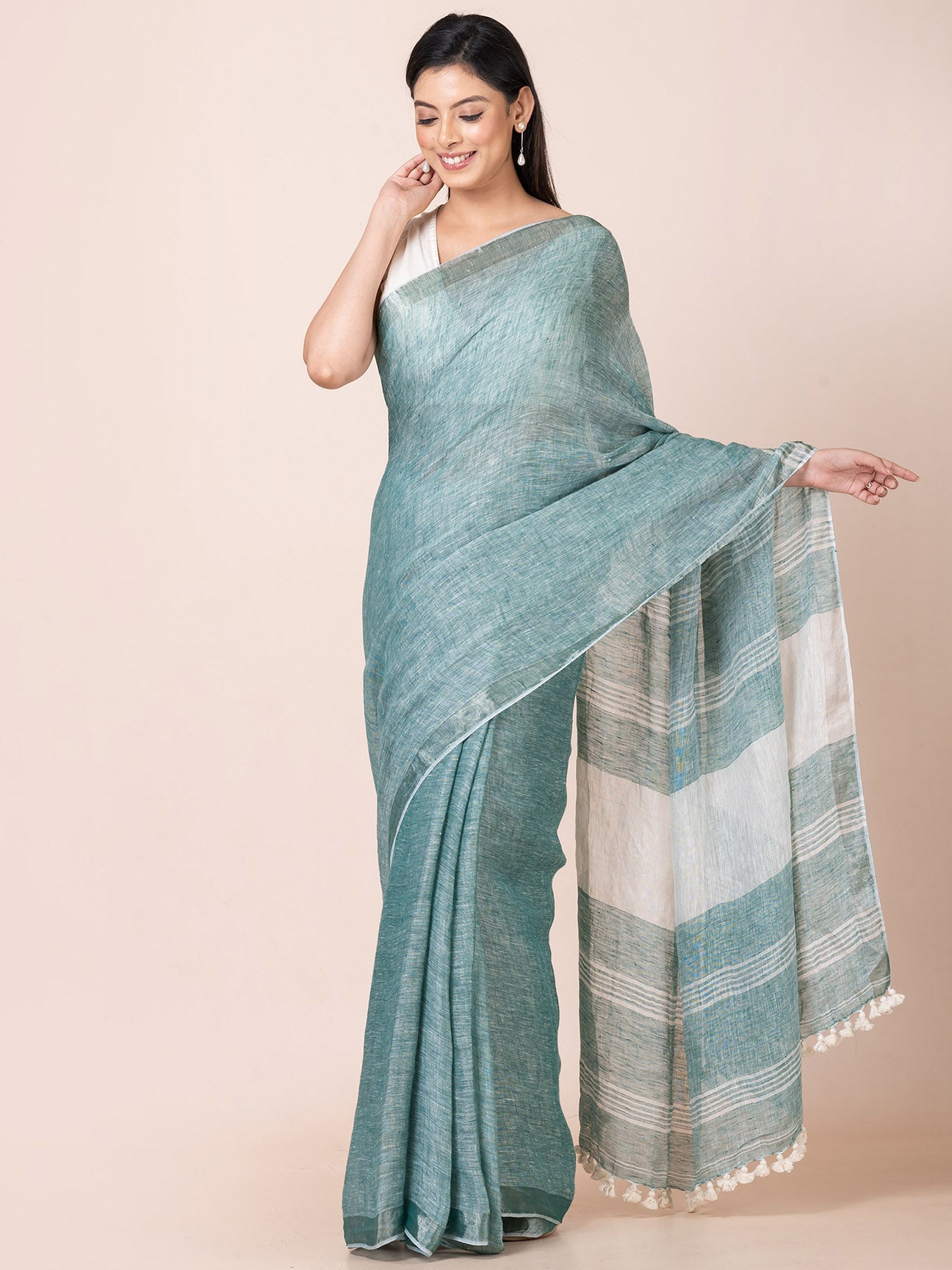 Our pastel handloom linen saree with minimal design is perfect for any occasion, from a casual day out to a special event.