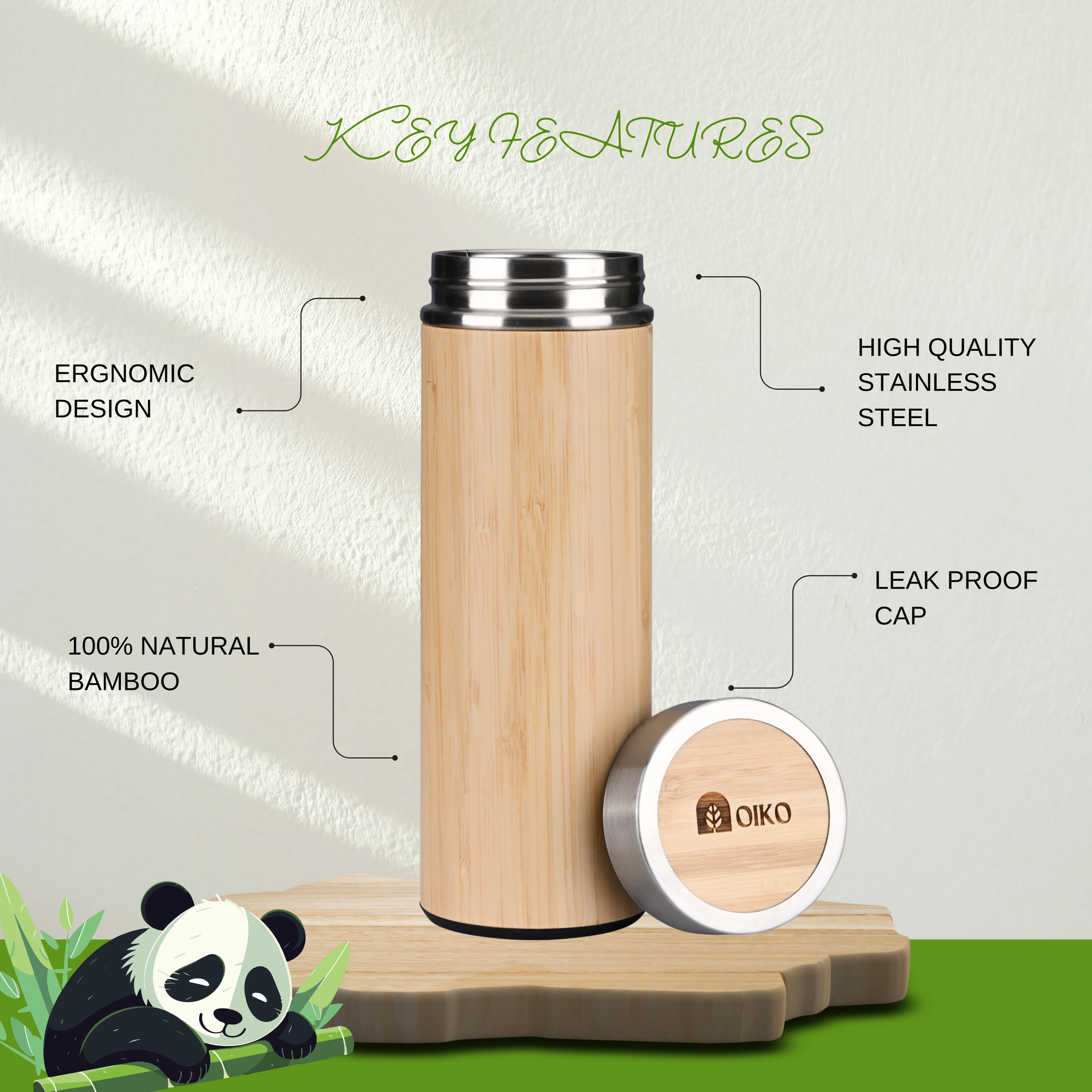 OIKO Bamboo Stainless Steel Water Bottle (Insulated) 500 ML