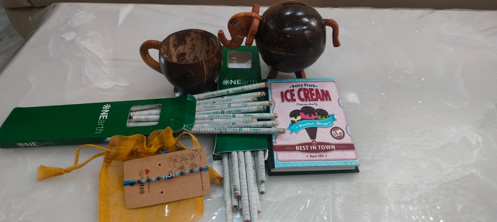 Colouring Pencils (Plantable Seed): These pencils are made of recycled waste paper and comes with lead of 10 different colours. Also each pencil have seeds at its one end of different plants. Children can learn and grow with them.