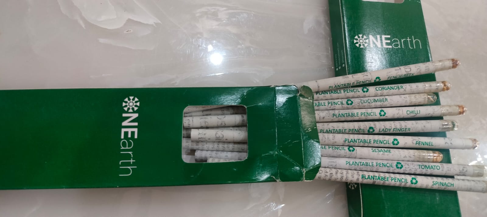 Paper Pencil (Plantable Seed): These pencils are made of recycled waste paper and comes with lead of same grey colour. Also each pencil have seeds at its one end of different plants. Children can learn and grow with them.