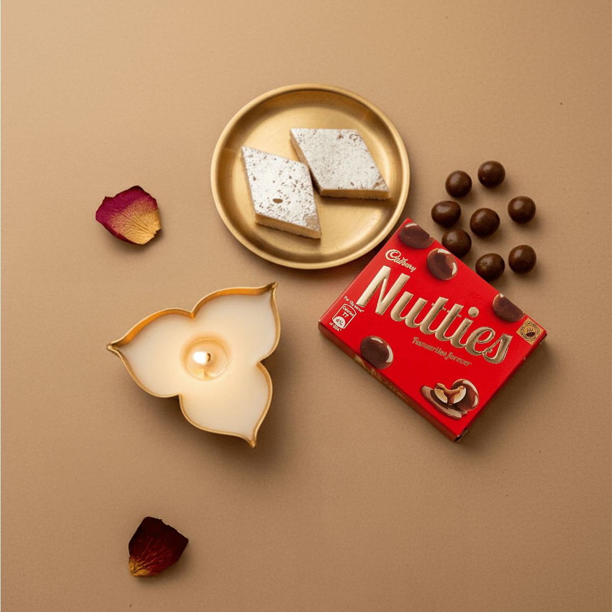 Hand-poured in the soothing fragrance of rose musk, this 3-petal urli is perfect for sharing festive warmth. Paired with cadbury Nutties and a festive card, it makes a thoughtful gesture for neighbors, visitors, or large group gifting.