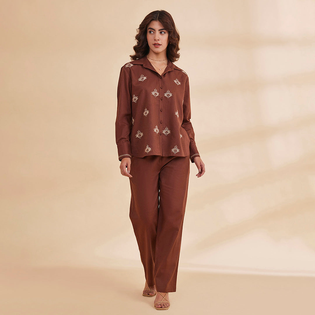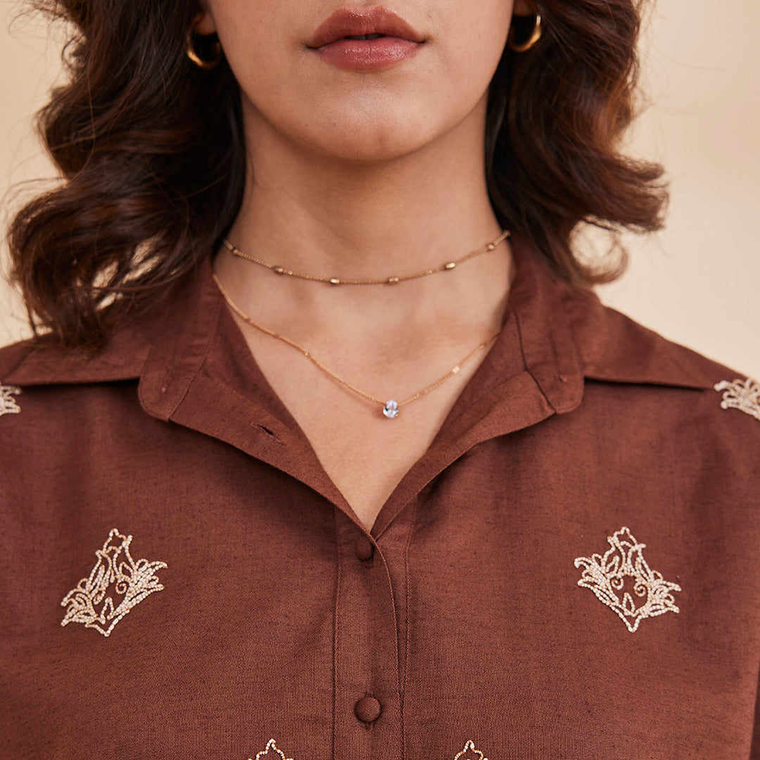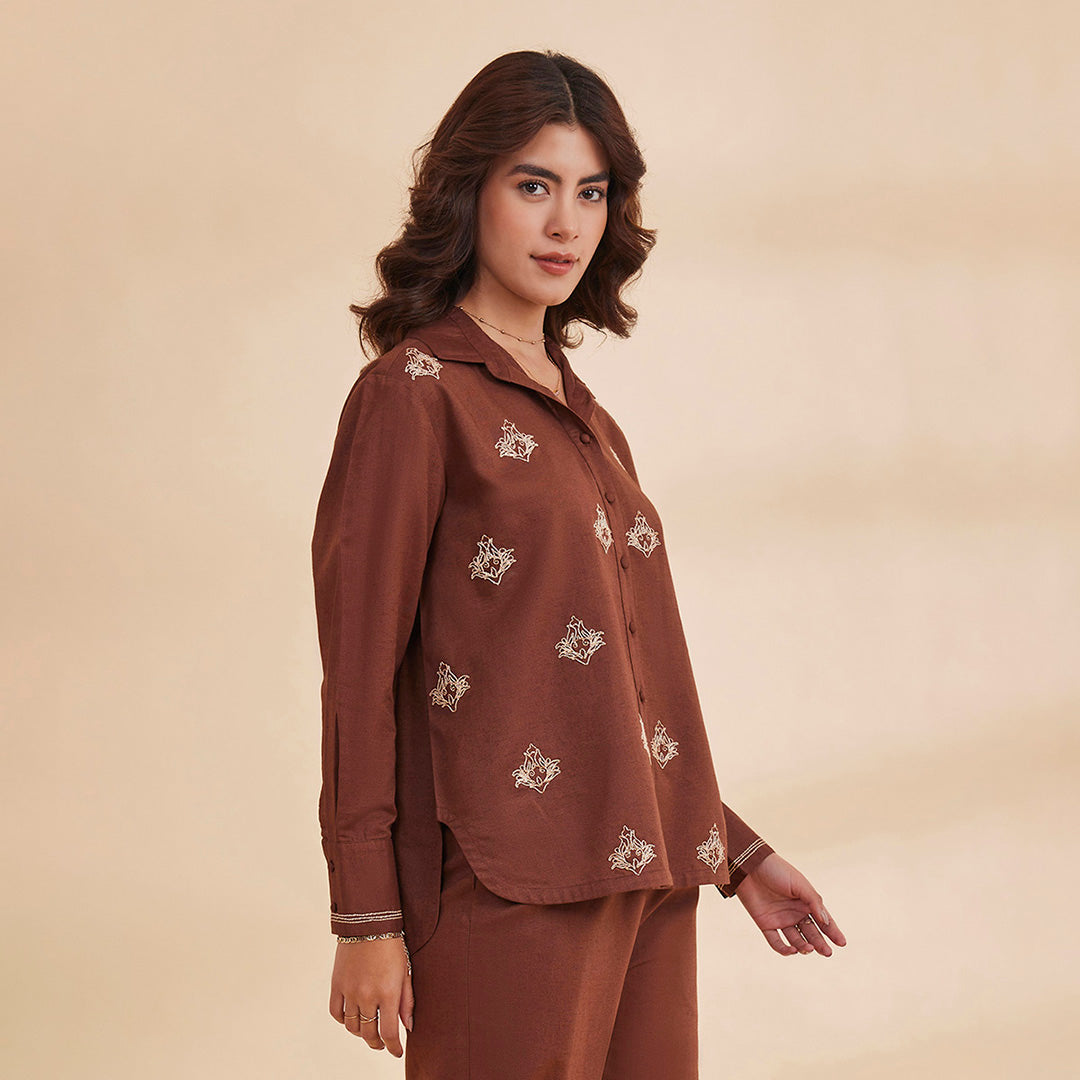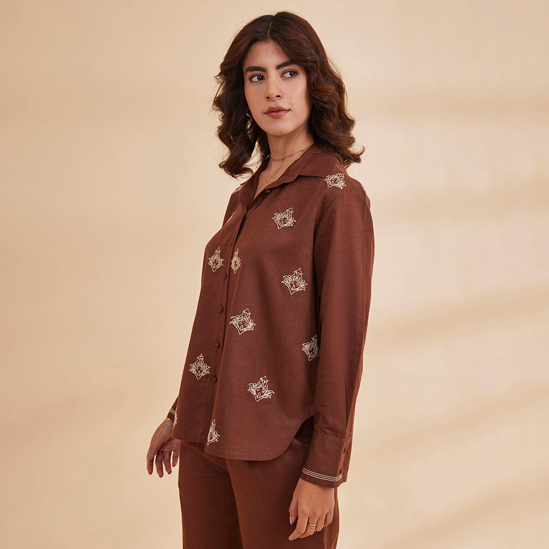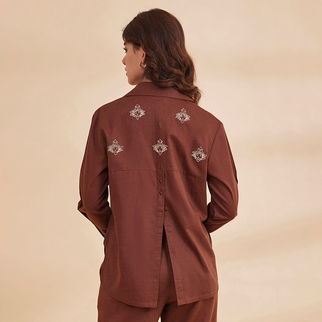 B77 Women's Organic Cotton Linen Embroidered Shirt With Back Slit/Brown