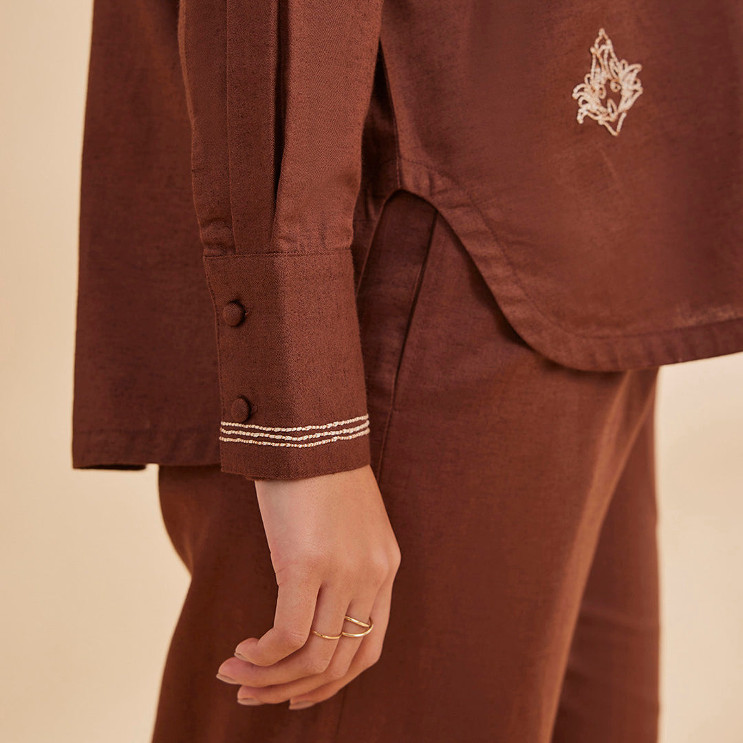 Elevate your everyday wardrobe with the B77 Earthy Brown Embroidered Shirt, where effortless comfort meets subtle elegance. Crafted in Cotton Linen Excel, a blend of sustainably farmed cotton and eco-friendly Lyocell, this shirt offers a comfort fit and true-to-size silhouette. The embroidered bodice and cuffs, paired with a shirt-style collar and full front placket, give it a polished look, while the back slit detail adds a touch of modern flair.
