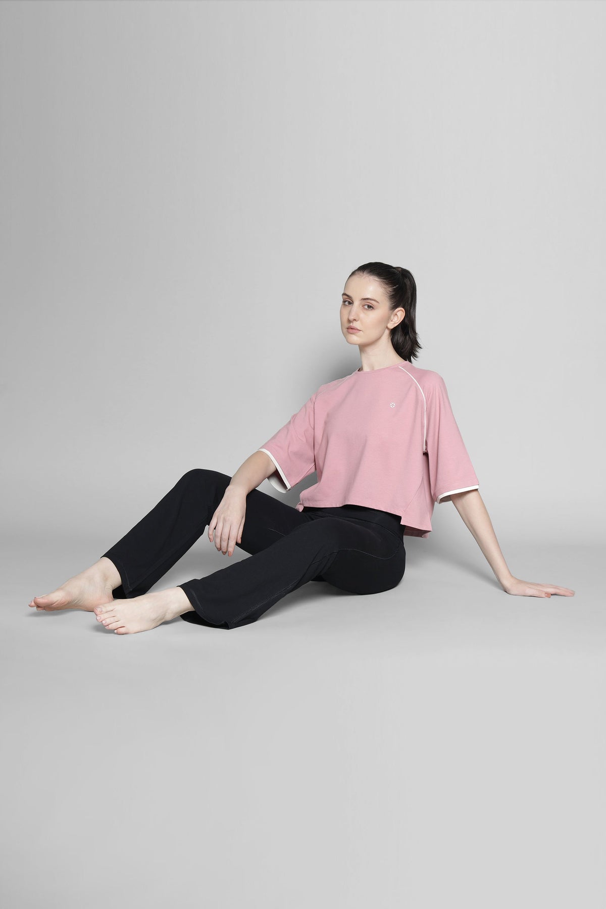 This color-blocked tee blends a laid-back silhouette with clean, athletic detailing. Designed in a soft cotton-modal knit, it features a relaxed cropped fit that falls effortlessly on the body. The raglan sleeves are contrasted in black with olive piping, adding definition and a touch of sport-inspired character. Wide half sleeves ensure easy movement and comfort, while the high crew neckline keeps the look polished. A versatile essential that pairs seamlessly with shorts, joggers, or flared pants - perfect for workouts, travel, or everyday wear.