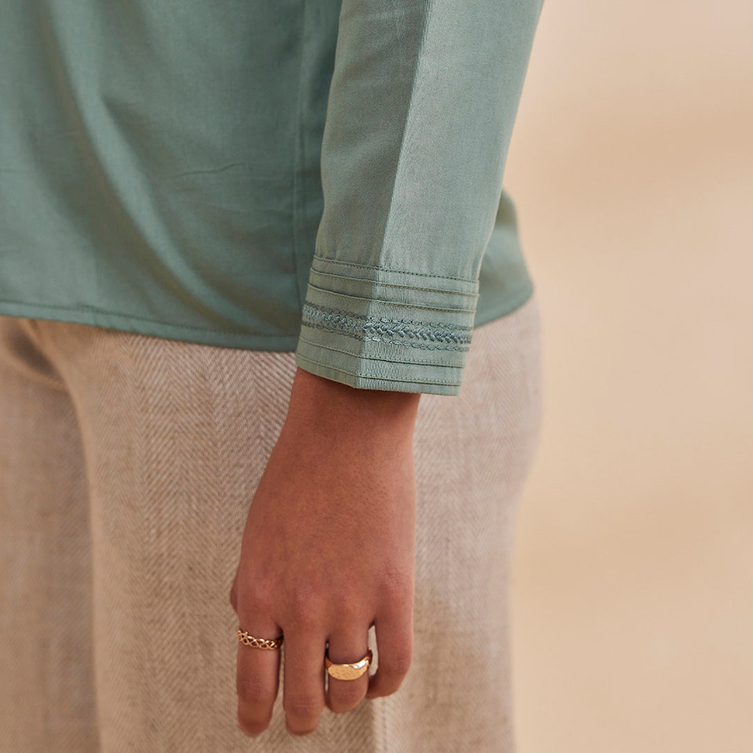 • Elegant Detailing: Tonal embroidery on cuffs for refined charm.