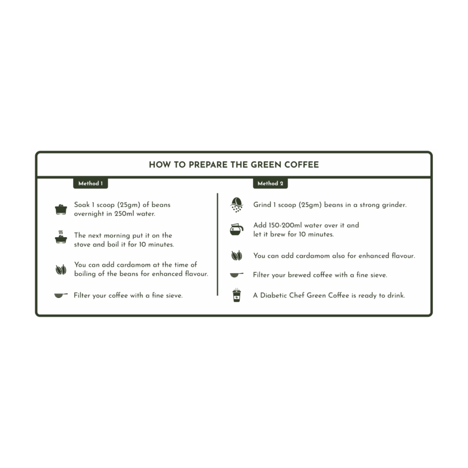 A Diabetic Chef Green Coffee Beans are unroasted Arabica Plantation ‘AAA’ coffee Species. They are 100% natural, fresh, raw, and organically grown arabica coffee beans. Our green coffee beans go through very mild treatment in a special manner to preserve the important ingredients. They are a boon for people who want to take control of their wellness.