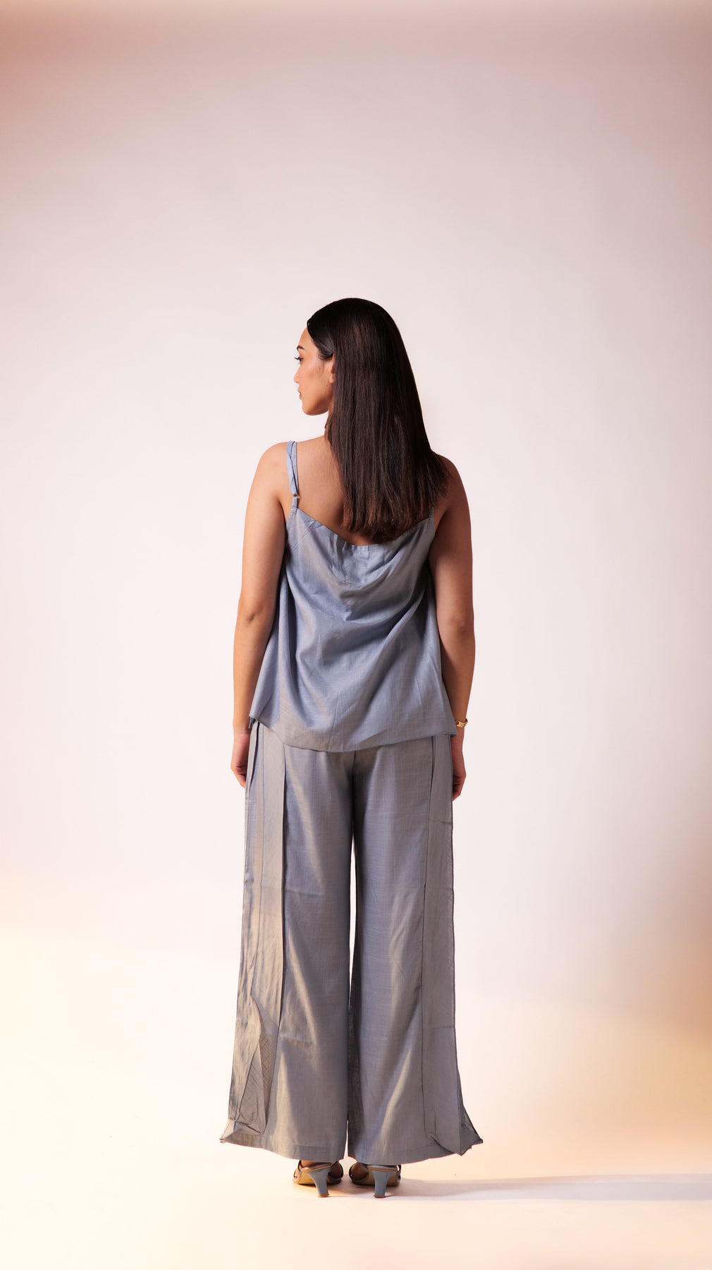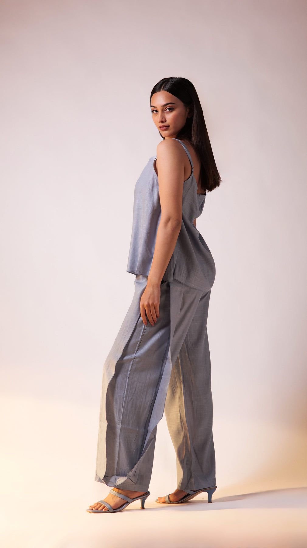 - The lightweight, sleeveless top with thin spaghetti straps gives a delicate and feminine touch to the outfit. Its minimalist design allows it to pair effortlessly with the statement pants, creating a balanced look.