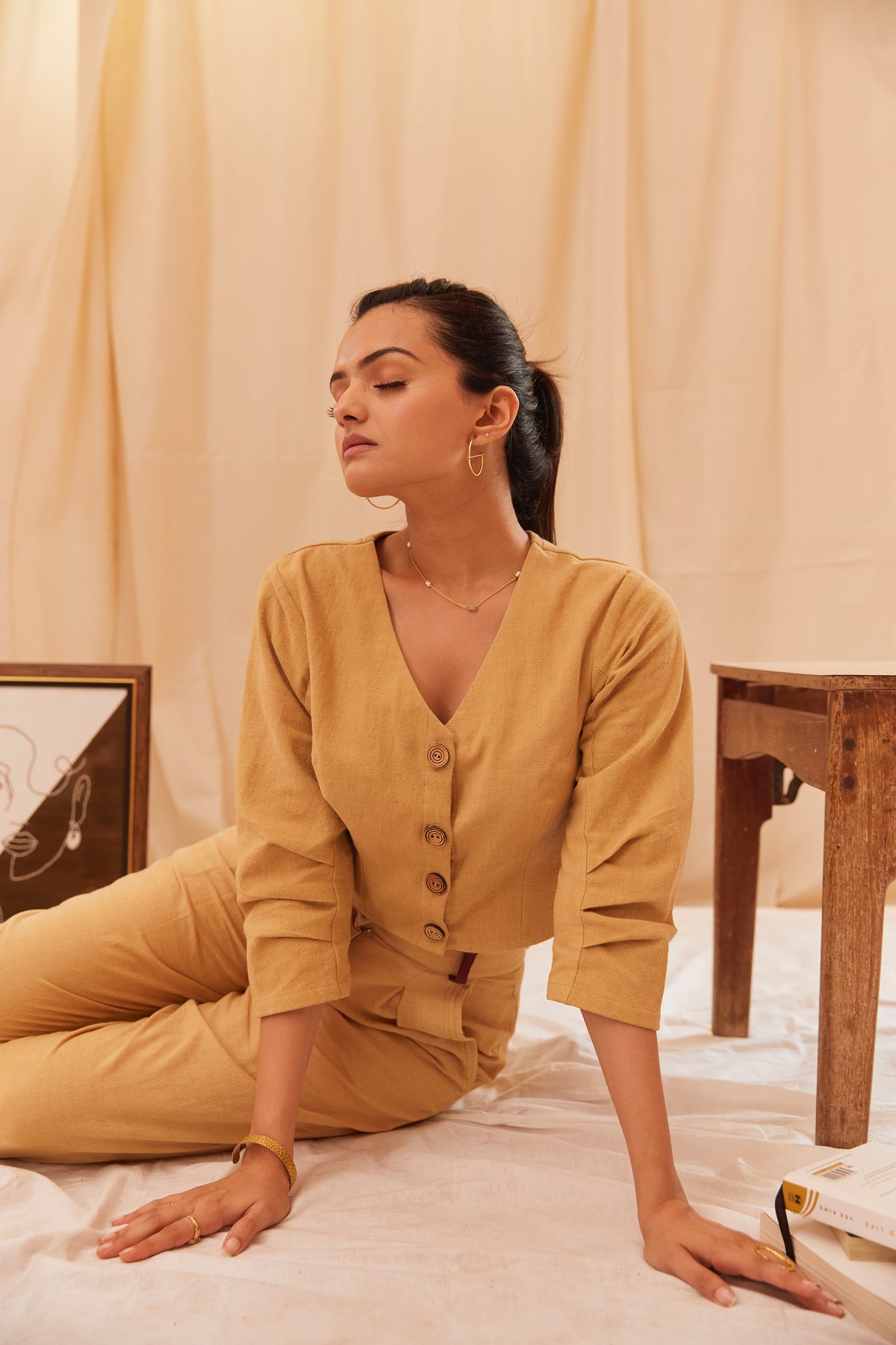 This statement naturally dyed cropped shirt with line embroidery on the back from The Conscious Closet is all about refined and classic fashion. The wooden buttons in the front, a few gathers on the 3/4th length sleeves and a smart v-neckline offer a tidy finish to this pale khaki shirt.