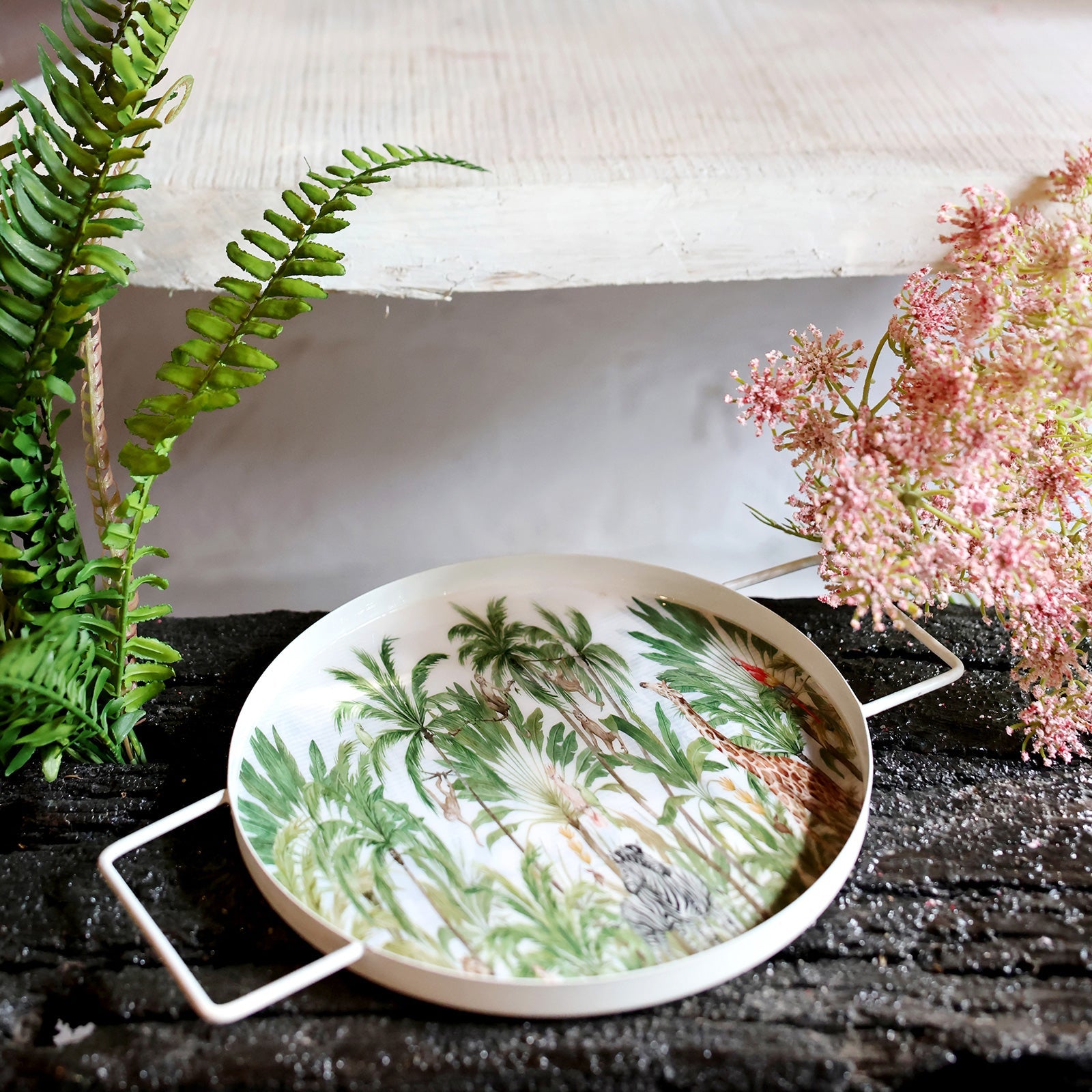 The Palm Haven Tray - S evokes the serene beauty of a lush forest, seamlessly blending art and nature. Its intricate design, inspired by verdant jungle landscapes, serves as a thoughtful reminder to honor and protect our natural world. More than a decorative piece, it invites reflection on the delicate balance of our ecosystems, making it an elegant yet purposeful addition to any space.