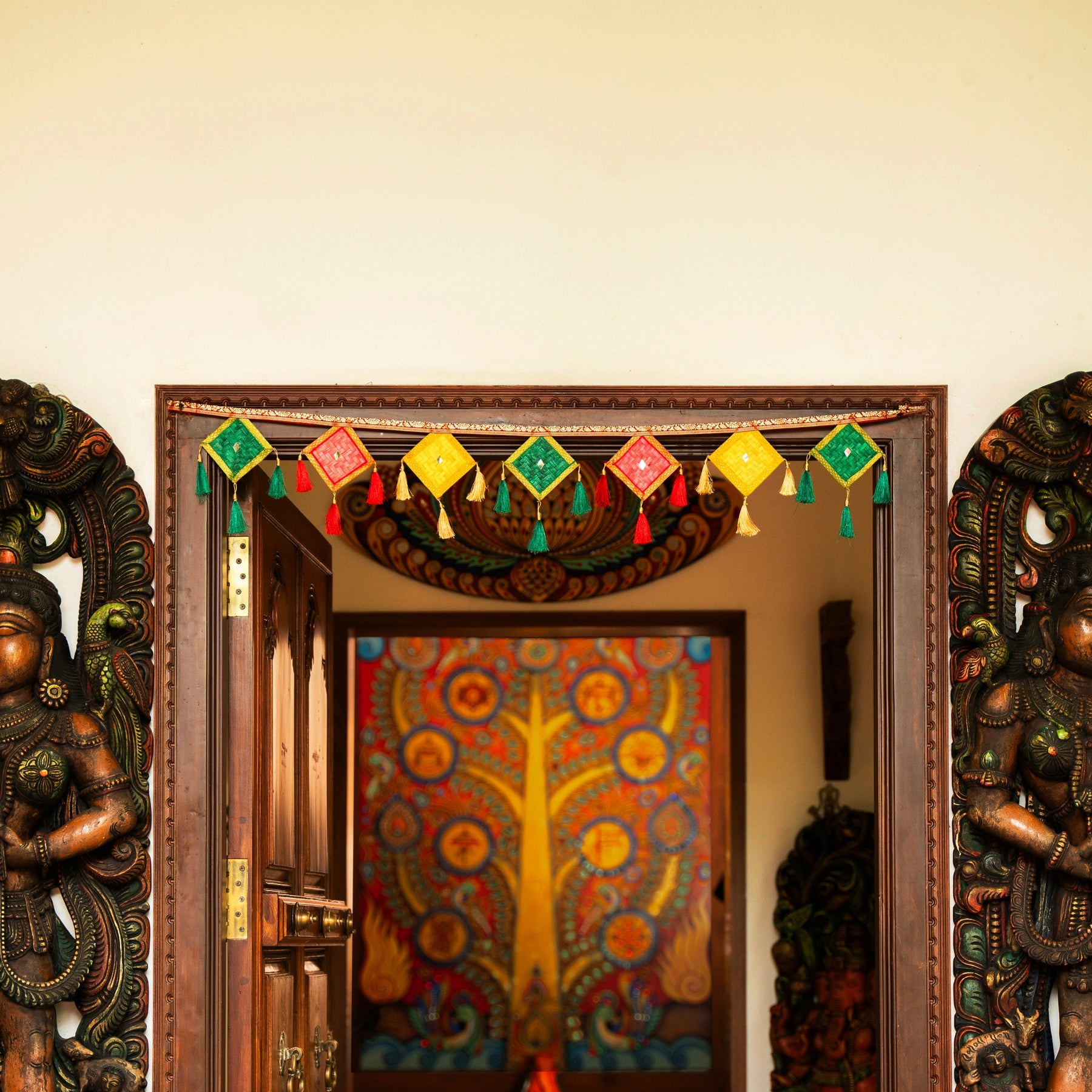 Handcrafted from natural bamboo, this eco-friendly toran adds a rustic charm to doorways and festive spaces. Lightweight, durable, and sustainable—perfect for traditional décor with a conscious touch.