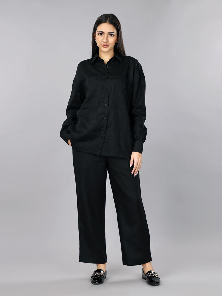 Elevate your everyday wardrobe with this effortlessly chic pitch-black pure linen shirt. Featuring an oversized shirt with a relaxed silhouette, this shirt blends comfort and style seamlessly. The shirt is adorned with practical front pockets and a subtle, understated button-down design, perfect for layering or wearing solo. Made to order: 7-14 Business days to ship