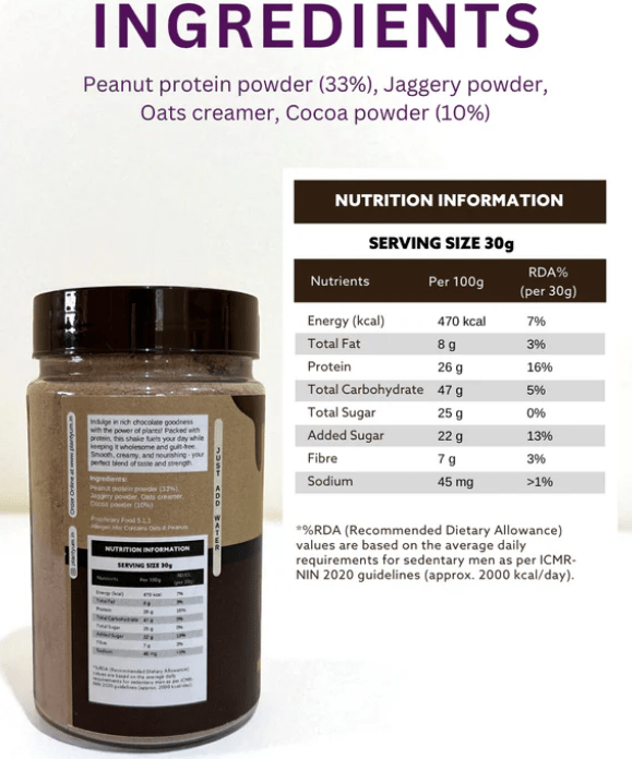 Peanut protein isolate(35%), Jaggery powder, Oats creamer, Cocoa powder(10%)