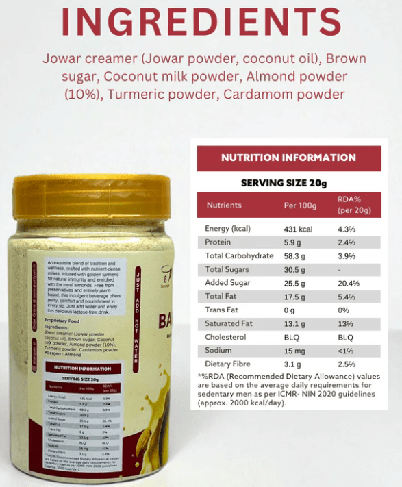 Jowar Creamer, Brown Sugar, Coconut Milk Powder, Almond Powder (10%), Turmeric Powder. Cardamom Powder