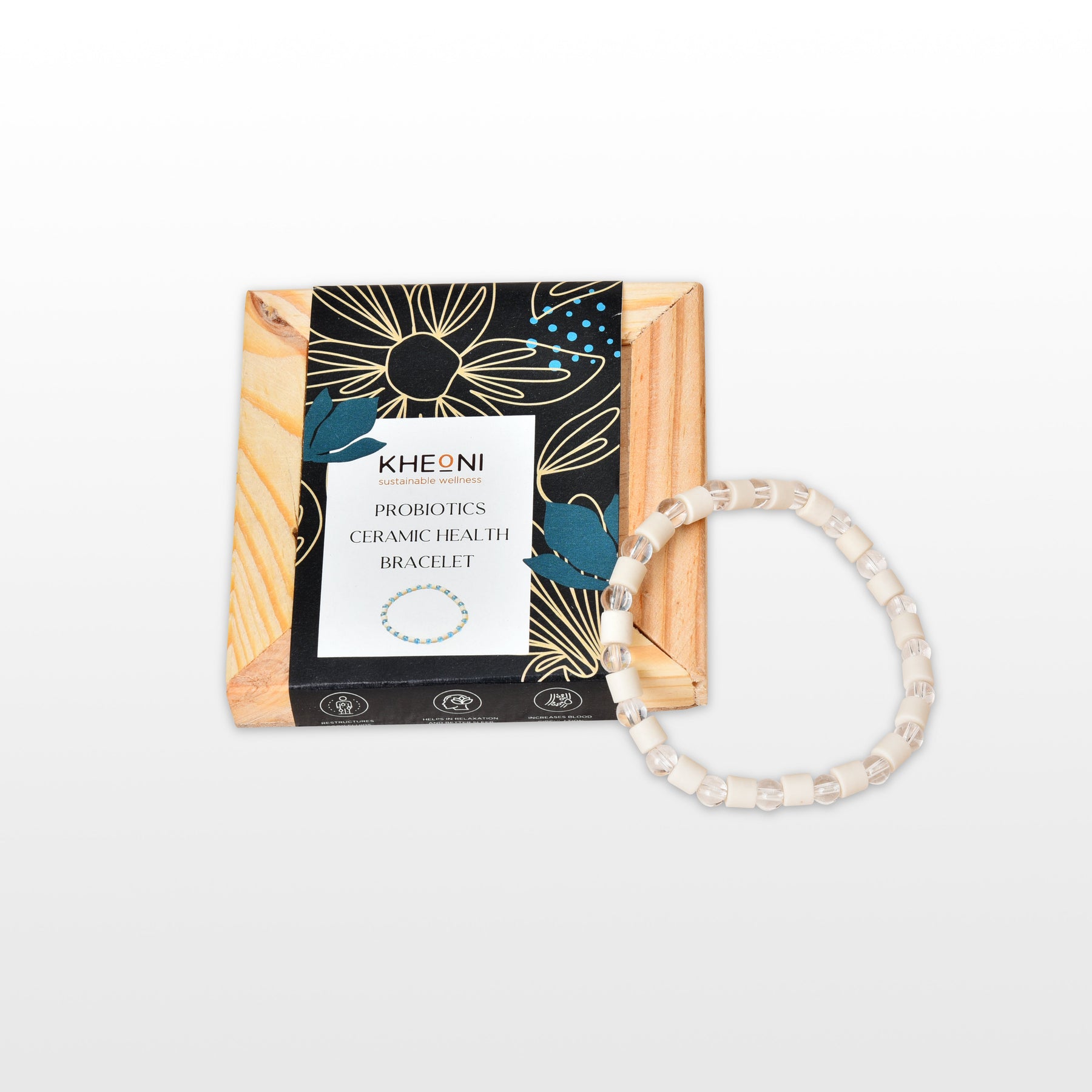 Kheoni Therapeutic Ceramic Bracelet emits far-infrared frequencies, the longest rays in the light spectrum. These wavelengths are highly compatible with the human tissue. The body can easily absorb them up to 3 inches deep. Wear the bracelet as often as possible. Your probiotics well being jewellery is made from probiotic ceramic beads & glass beads. Keep the ceramic beads white by regularly washing with natural soap.