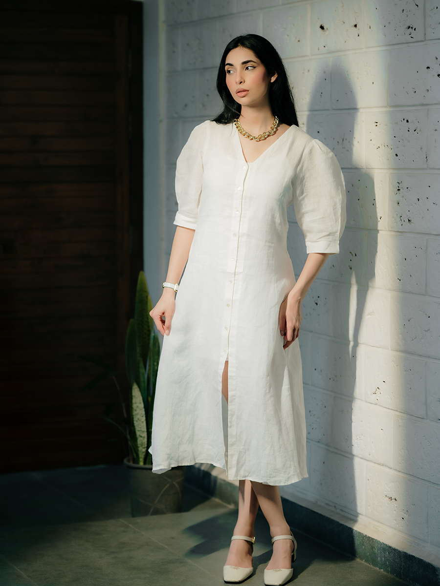 PUFFED SLEEVE MIDI LINEN DRESS