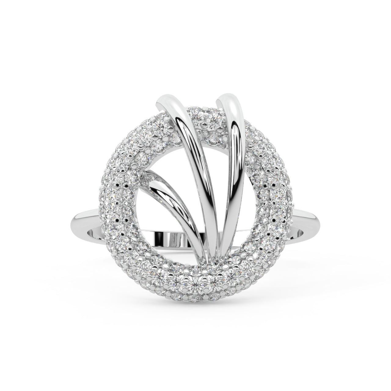 Make a lasting impression with this bold and radiant diamond ring, designed to reflect refined opulence. The centerpiece is a shimmering circular halo paved with rows of round brilliant-cut diamonds, accentuated by elegant golden arches that rise through the ring like a blooming sculpture. A timeless piece that transitions beautifully from festive wear to formal evenings.
