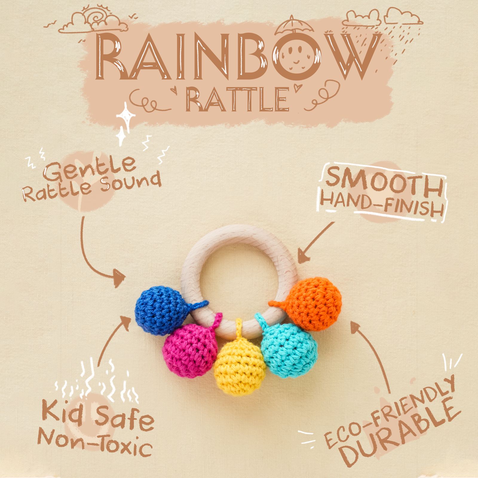 Bright, bouncy, and full of gentle jingles—our Rainbow Rattle Teether is a sensory celebration for your little one! Crafted from smooth, baby-safe wood and topped with soft crochet balls in cheerful rainbow hues, this teether does more than soothe sore gums—it delights tiny ears with a soft rattle