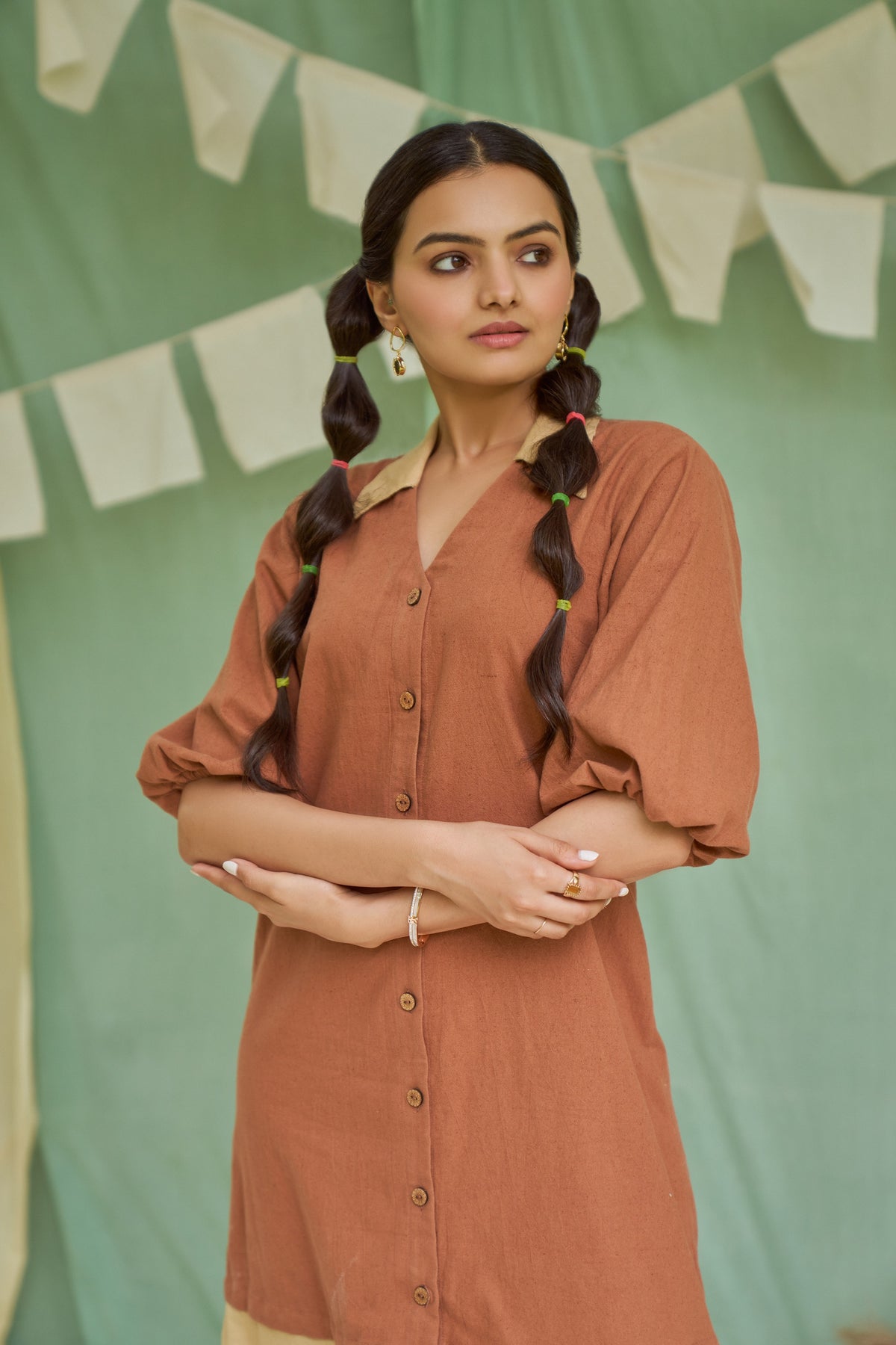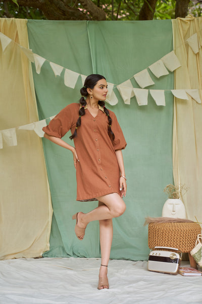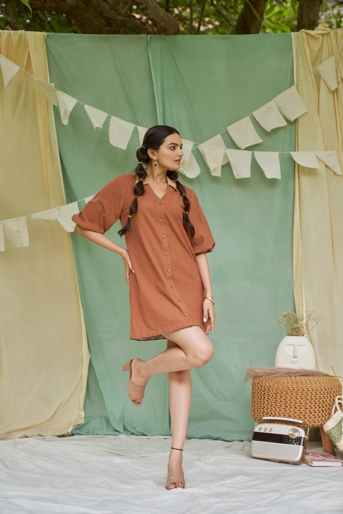 Our Raw Umber Short Dress embodies easy elegance. This mini dress boasts a naturally dyed hue, a V-neck Johnny collar with a playful contrast color, and a relaxed fit that's both comfy and chic.