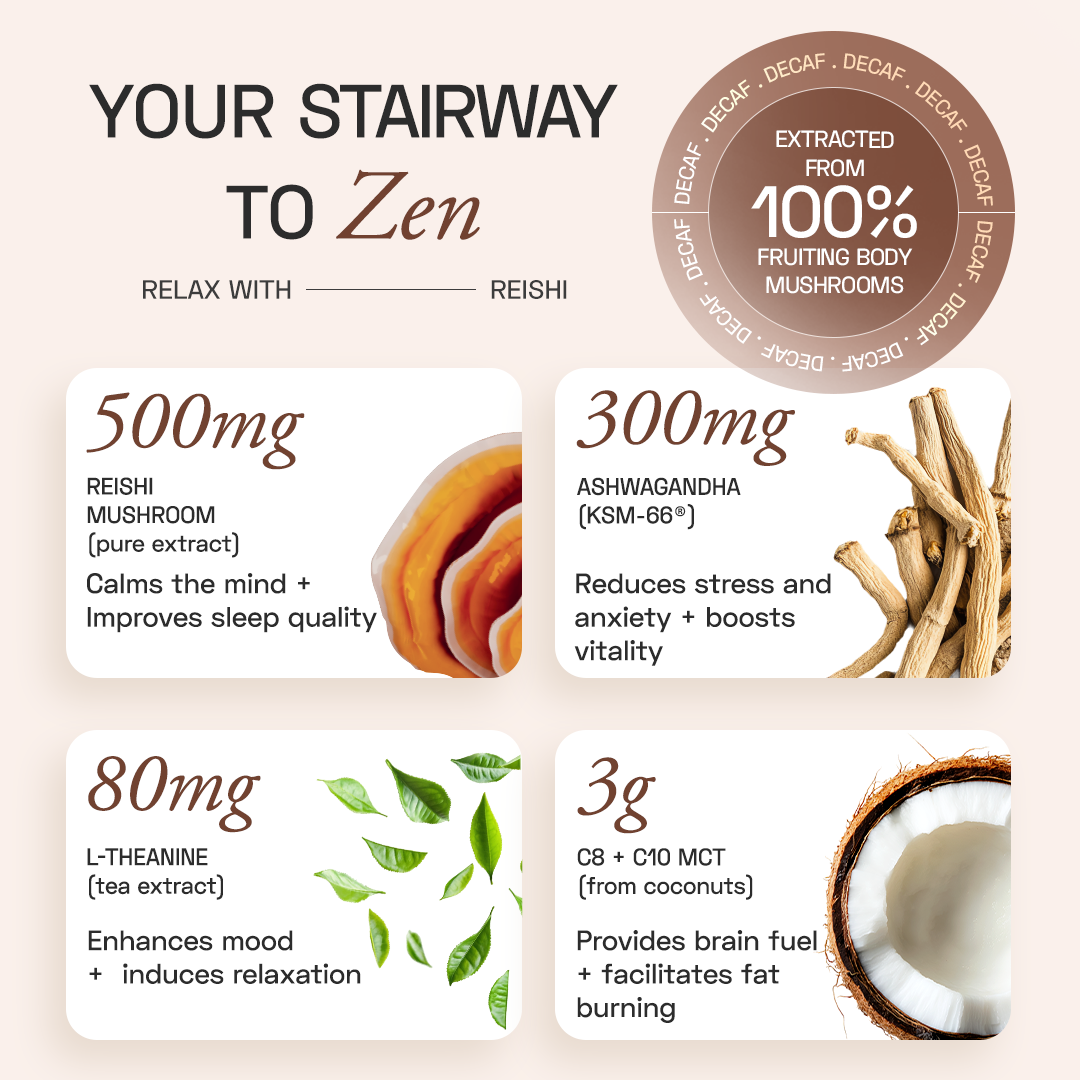 The calm you seek lies at the bottom of your cup of Reishi Shroom Coffee. This decaf blend, powered by 500mg of pure Reishi mushroom extract, helps you shift into a restful, vacation-like state of mind. Crafted with artisanal coffee, it offers a perfect coffee break by day or night, free from the jitters and caffeine crash associated with regular coffee.