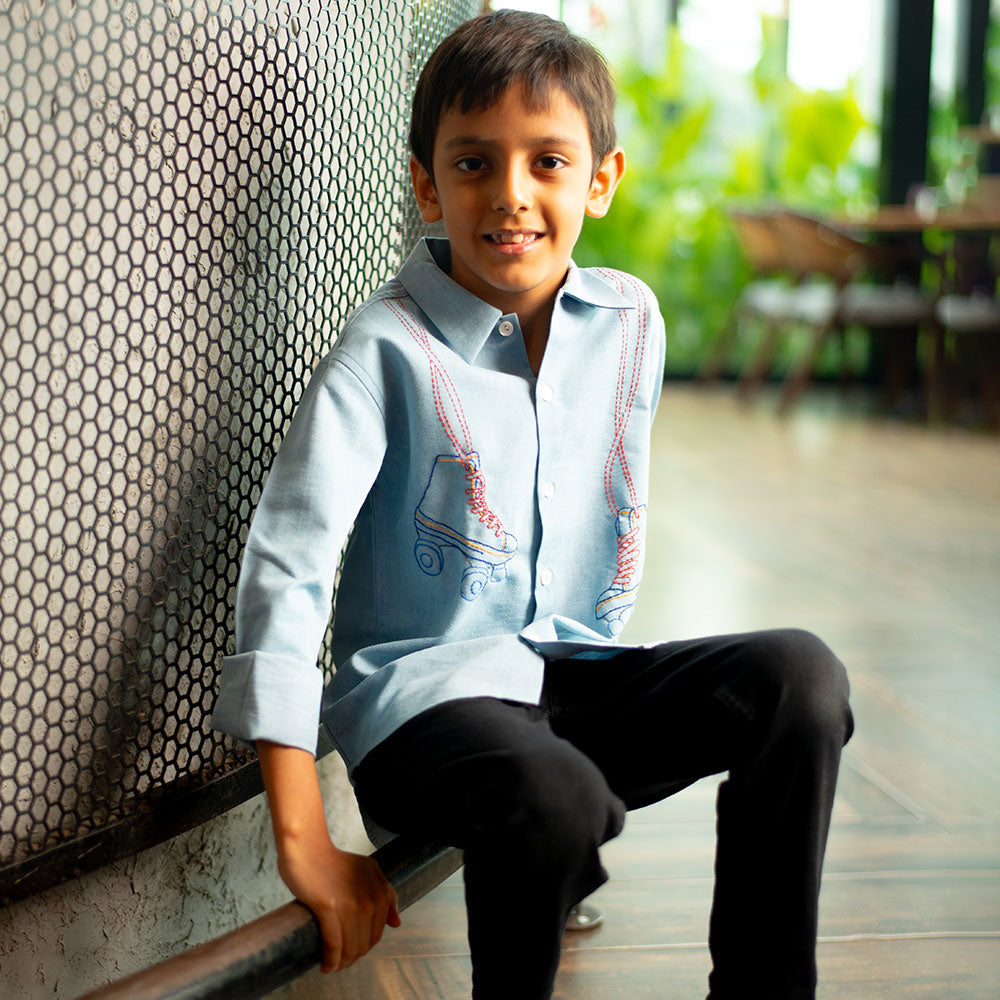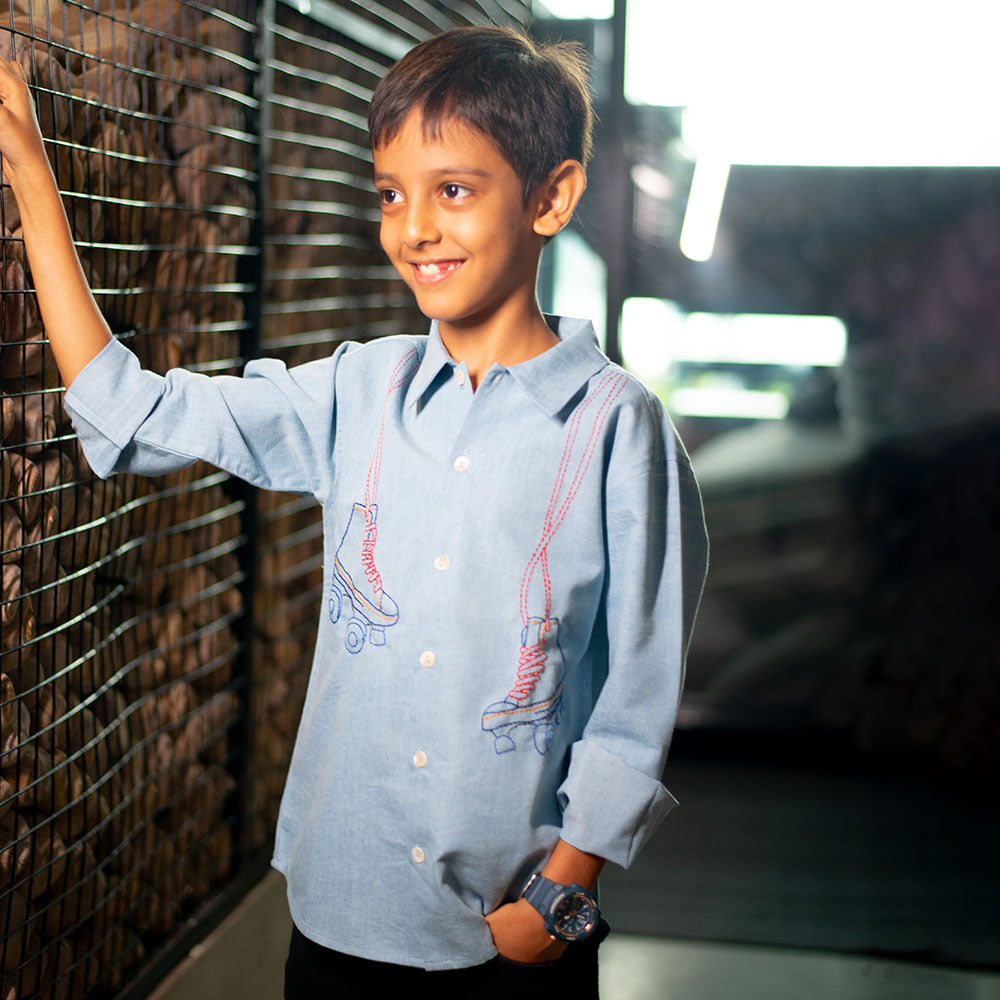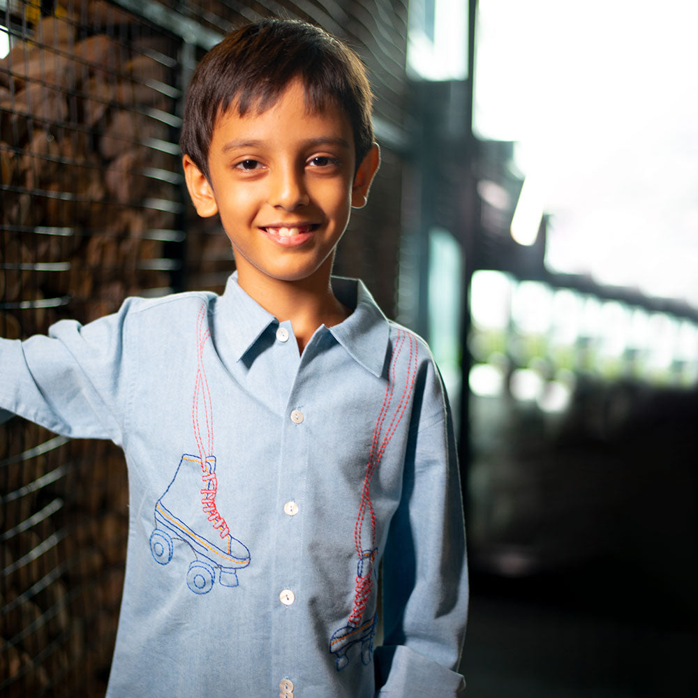 Skate into style! This cool blue denim shirt features quirky embroidered roller skates for the kid whoäó»s always on the move. Made with soft, durable 100% cotton denim äóî perfect for playdates, parties, and zooming through the day.