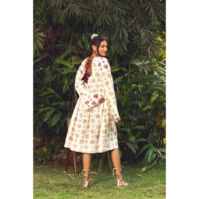 The mid-length dress features long sleeves and is adorned with a rose block print across the garment, adding a touch of elegance and charm. Detailed embroidered roses embellish the sleeves, enhancing the intricate design. With a V neckline, the dress offers a flattering silhouette, while the back neck tie-up adds a stylish element. Additionally, there is a side opening for ease of wear and added comfort.