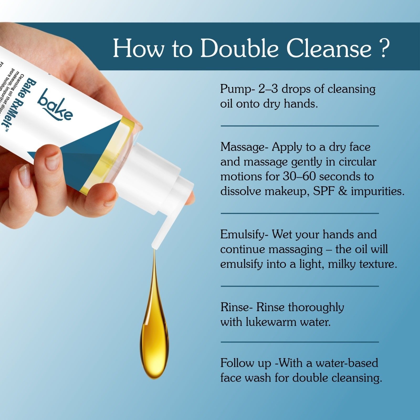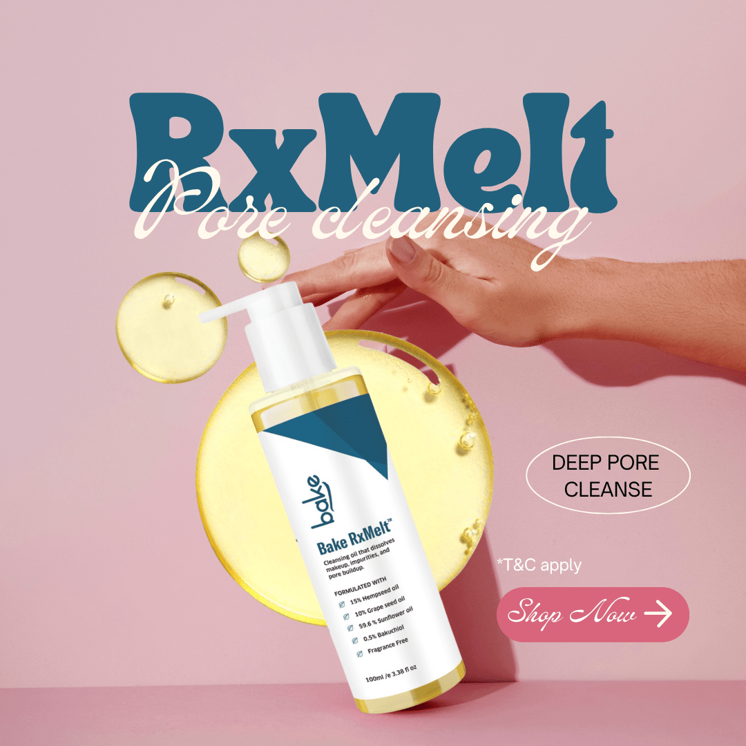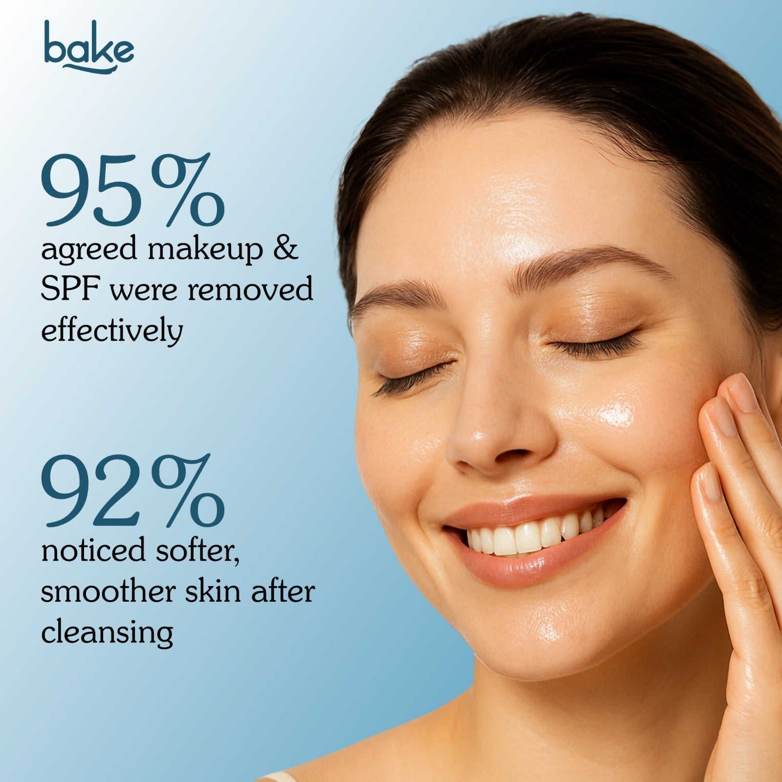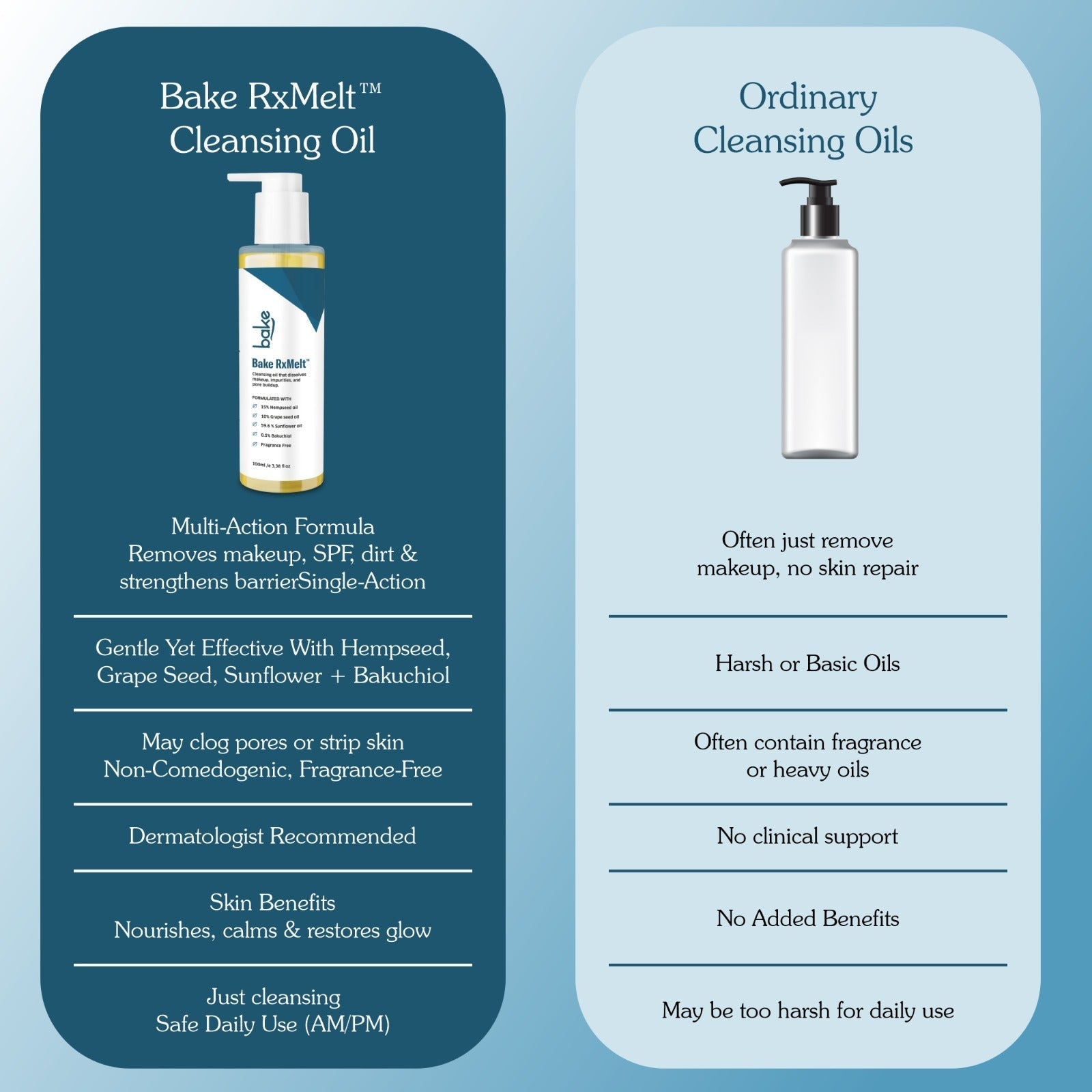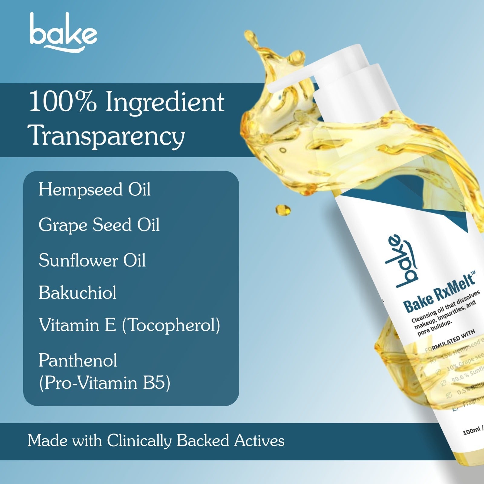 BAKE RxMelt™ Cleansing Oil, a lightweight, fragrance-free formula designed to dissolve makeup, sunscreen, and impurities without stripping your skin.