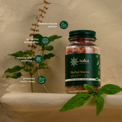 Saka Organics - Herbal Haven | Handmade Tulsi and Basil Bath Salt | Natural Relaxation for All Skin Types (50gms)