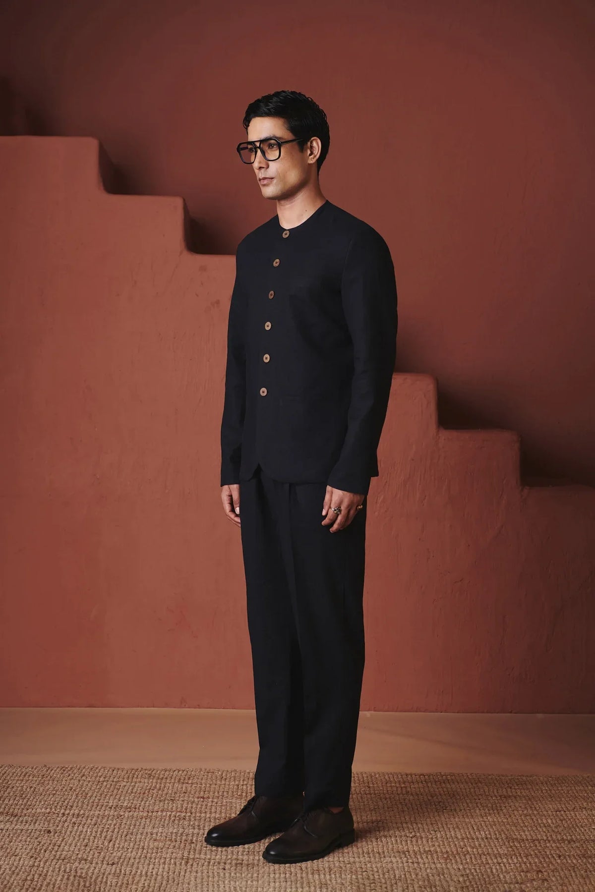 Tailored trousers with sharp front pleats and a clean, tapered cut that narrows at the ankle. Designed for ease of movement with a structured waistband and subtle detailing, they balance comfort with sophistication. A versatile base that pairs seamlessly with kurtas, jackets, or shirts for both festive and refined everyday wear.