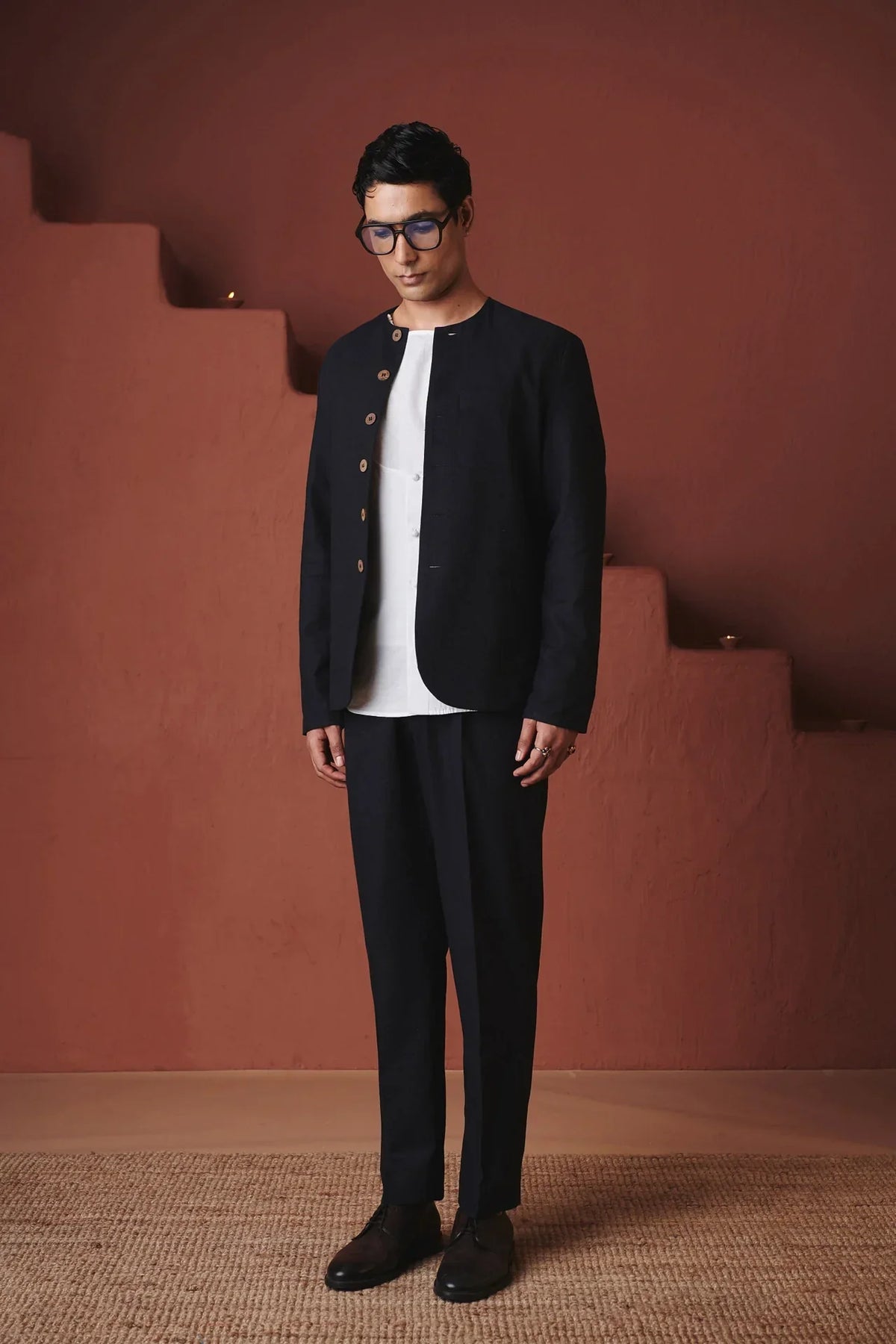 A sharp alternative to the classic bandhgala, this jacket features a clean round neckline, wooden button fastening, and tailored lines for a modern, minimal finish. Paired with straight trousers, it offers versatility to move from festive evenings to refined everyday dressing.