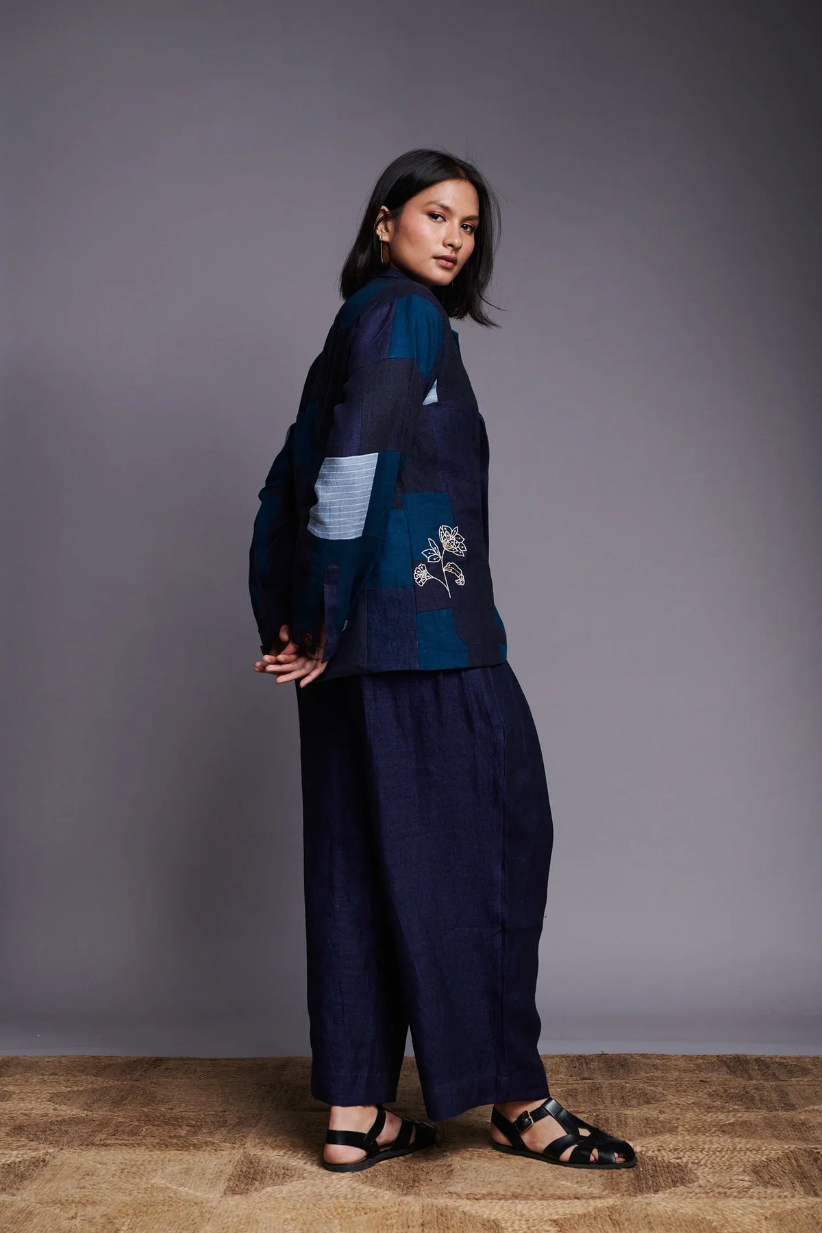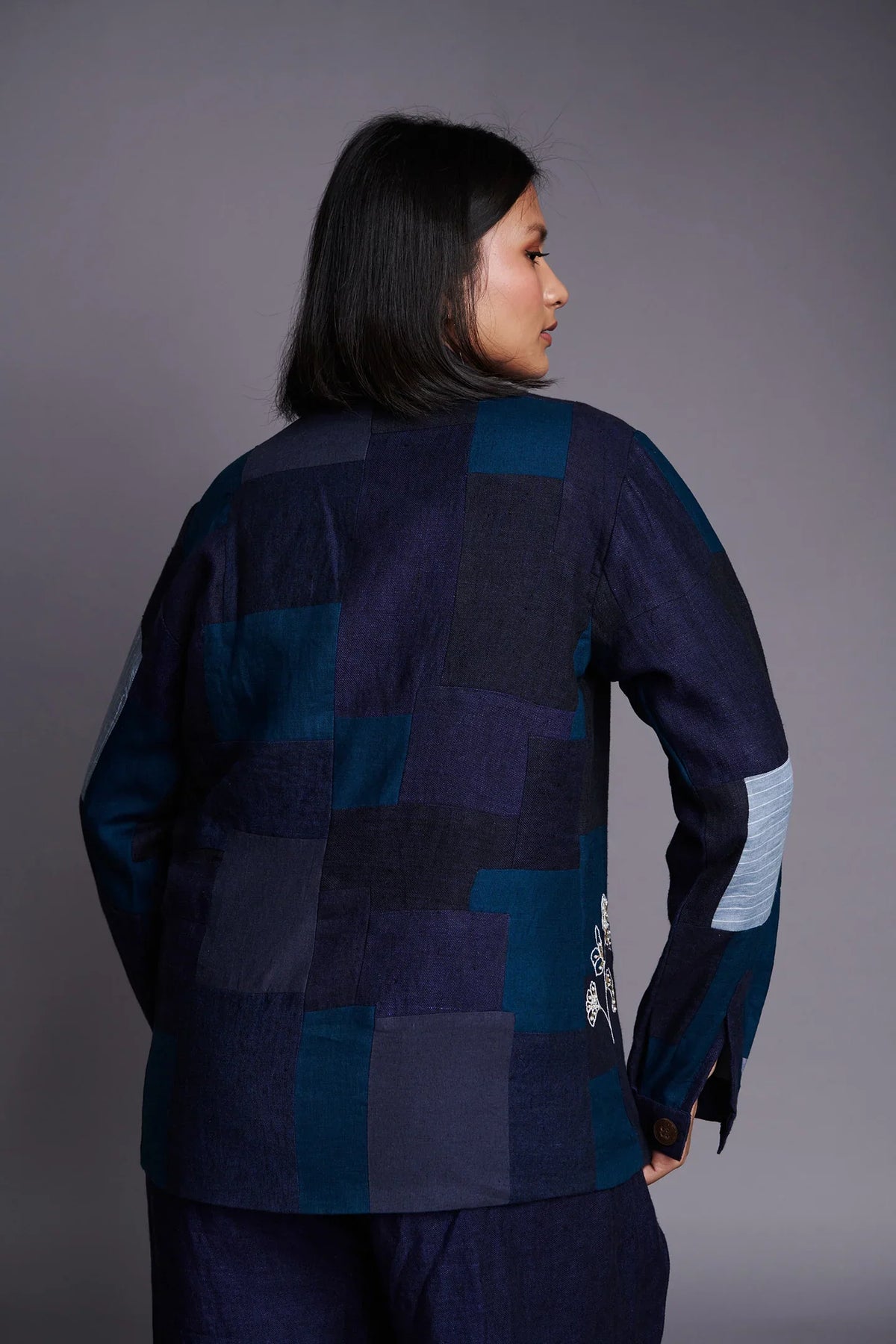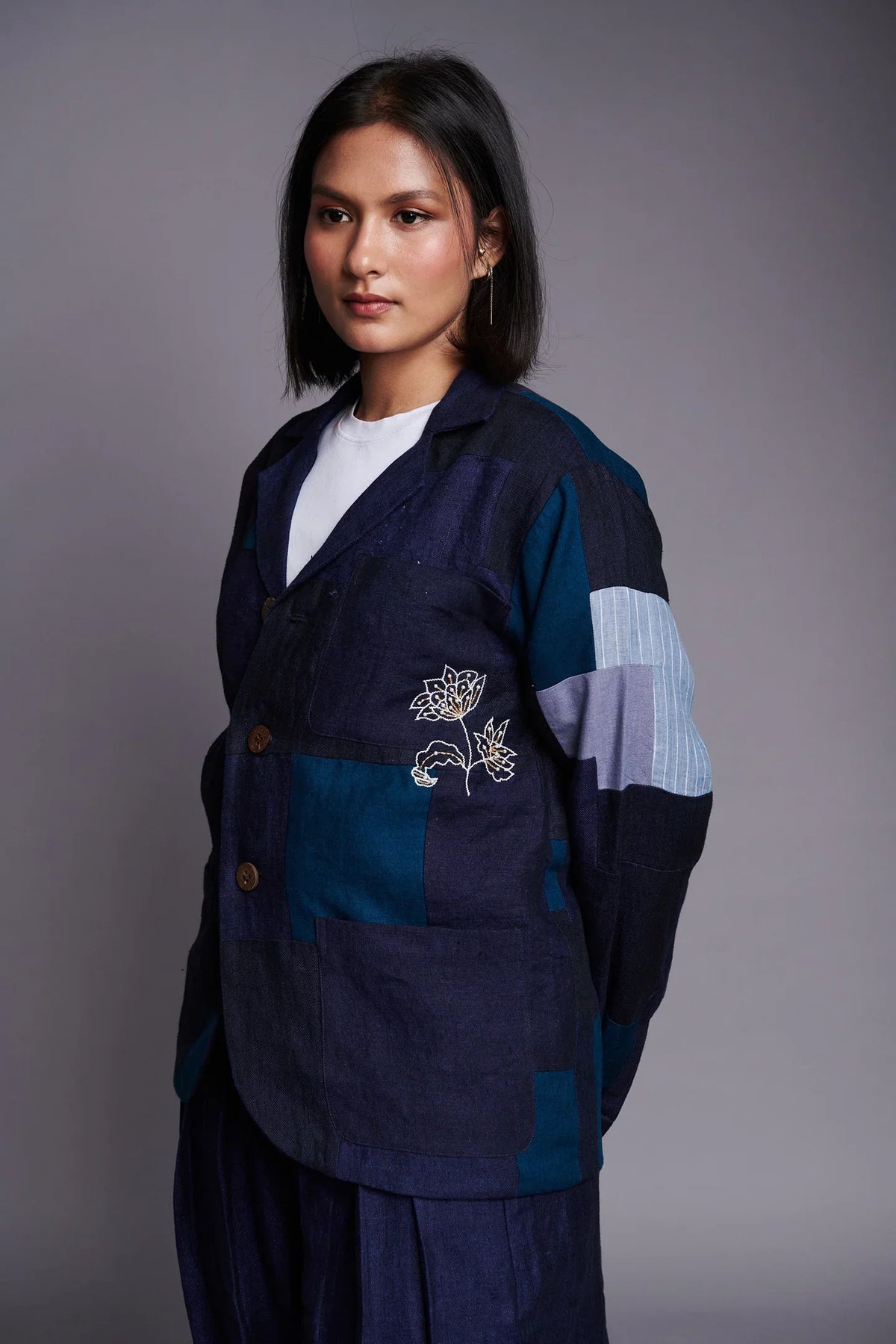 A relaxed blazer shaped from tonal patchwork, balanced with small embroidered details that bring a gentle contrast. The fit stays easy and unstructured for everyday layering. The curved hem and soft lapel keep the silhouette refined without feeling formal.