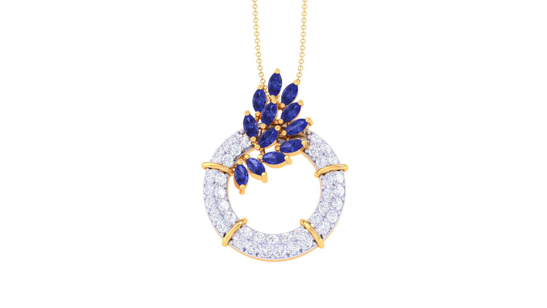 Gracefully poetic, this sapphire leaf wreath pendant evokes timeless elegance with a fresh botanical twist. Set in glowing 18K yellow gold, it features a circular frame fully encrusted with brilliant round diamonds, delicately accented by marquise-cut blue sapphires arranged like leaves. Each gemstone glimmers with depth and color, making this piece a radiant choice for evening elegance, festive dressing, or a luxe gift of nature-inspired beauty.