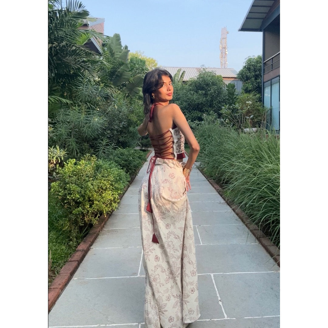 The Scarlet coordinated set features a hibiscus print top adorned with intricate front embroidery and an open tie-up back, adding sophistication. A contrast maroon tie-up allows for adjustable length, complemented by detailed pleating and a side zipper for easy wear. Paired with a long-length skirt in the same hibiscus print, the flowy design includes a side zipper and a convenient pocket. Charming frill details on the waistband complete the look with whimsical elegance.