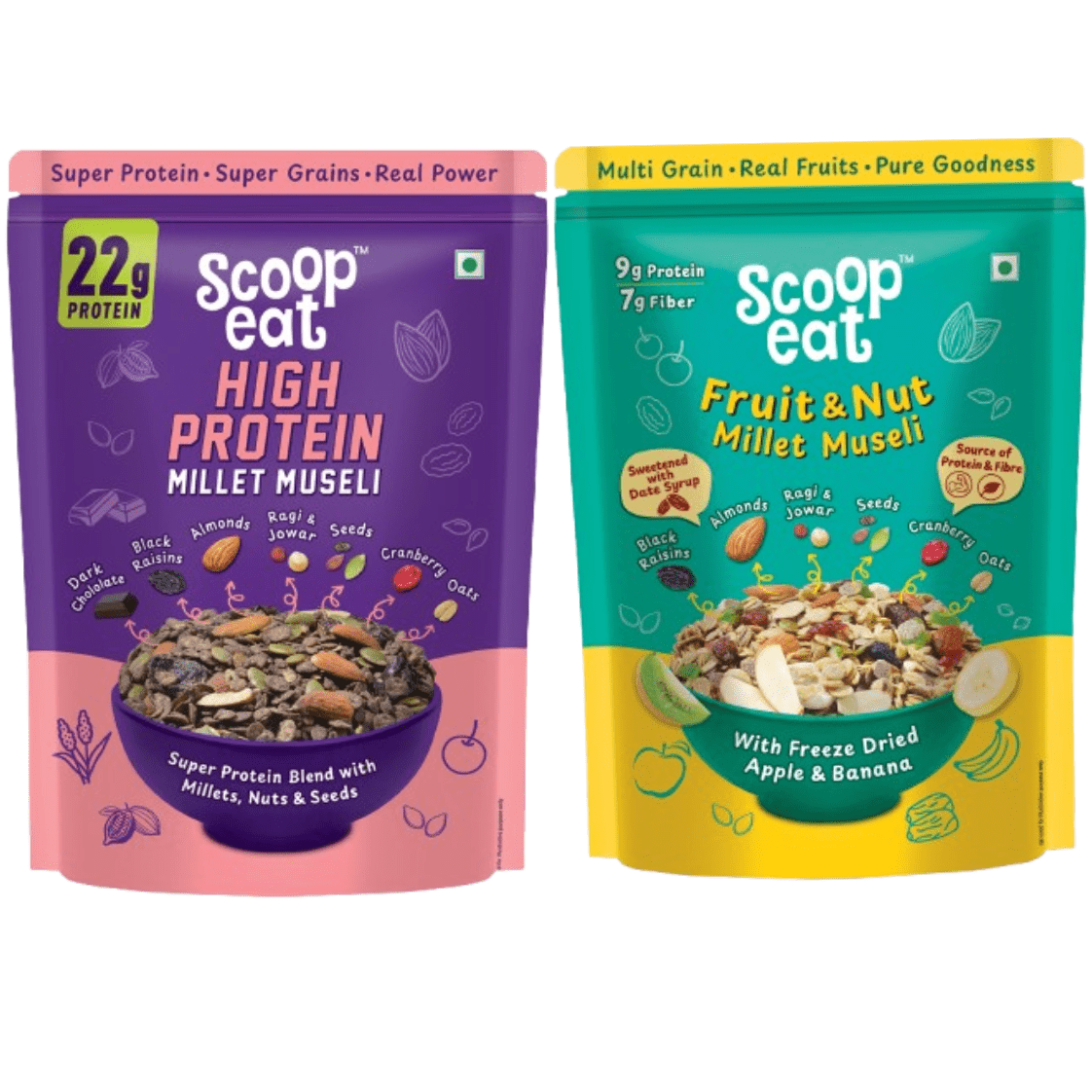 Scoopeat Assorted- Indulge in our carefully curated assortment pack featuring two of our delicious muesli variants: 22g High Protein Muesli, & Fruit LOVES Nuts Muesli with Pack of 2 (750gm Each). Each bite is a journey through the perfect blend of flavors and textures, ensuring you never get bored with your breakfast routine. Perfect for those who love variety and want to try a little bit of everything.