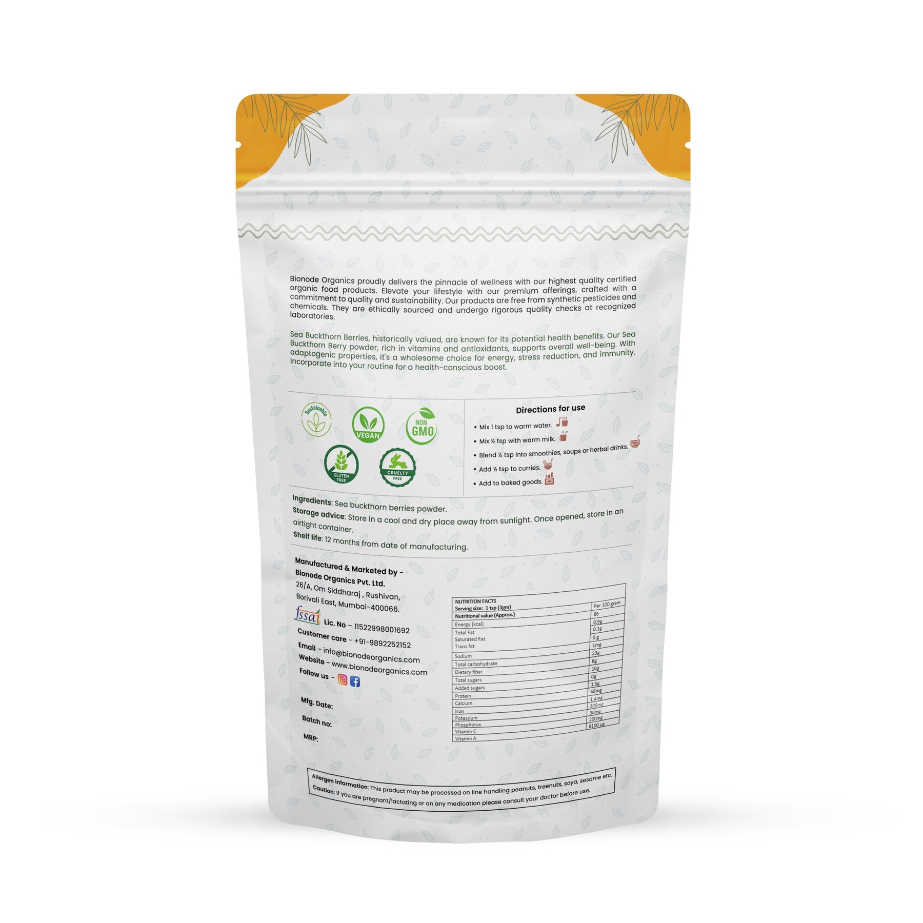 Introducing Bionode Organics’ Sea Buckthorn Berries Powder, meticulously crafted from the nutrient-rich berries of the Sea Buckthorn plant, scientifically known as Hippophae rhamnoides. Revered in Ayurveda for its holistic healing properties, Sea Buckthorn holds profound significance as a potent herbal remedy. Bursting with benefits, Sea Buckthorn Berries Powder is a powerhouse of nutrients, including vitamins (such as vitamin C, vitamin E, and vitamin A), minerals (including potassium, calcium, and magnesium), antioxidants, flavonoids, and essential fatty acids (like omega-3, omega-6, and omega-9). Its therapeutic effects encompass immune support, cardiovascular health, skin rejuvenation, digestive wellness, and overall vitality. Naturally cultivated, free from synthetic pesticides, insecticides & fertilizers our Sea Buckthorn Berries Powder embodies the purity and potency of nature. Embrace holistic well-being naturally with Bionode Organics’ premium Sea Buckthorn Berries Powder, your ultimate source of vitality and rejuvenation. Ingredients: Sea Buckthorn berries powder