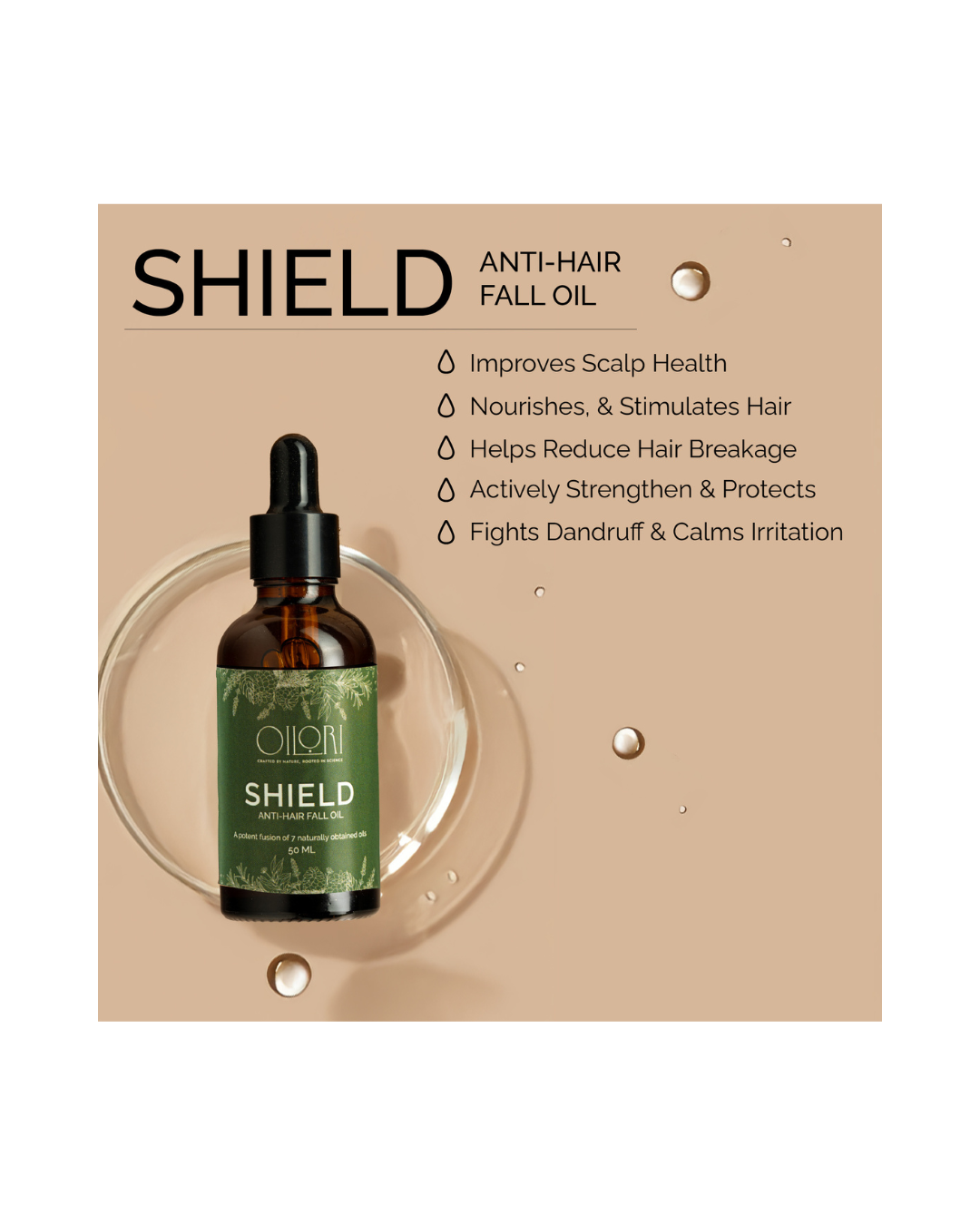 Rediscover resilient, beautiful hair with Oilori’s Shield Anti-Hair Fall Oil — a gentle yet powerful blend of seven botanical oils scientifically chosen to help reduce shedding, strengthen roots, and revitalize your scalp naturally.