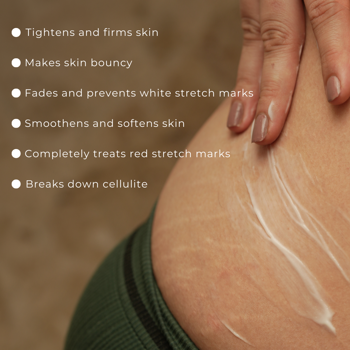 Formulated with clinically tested ingredients, it helps reduce the appearance of stretch marks and targets stubborn cellulite. Regular use enhances skin texture, smoothness, and suppleness.