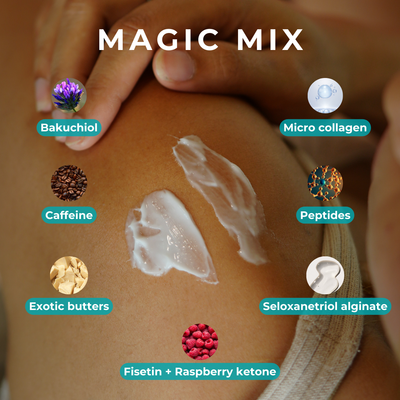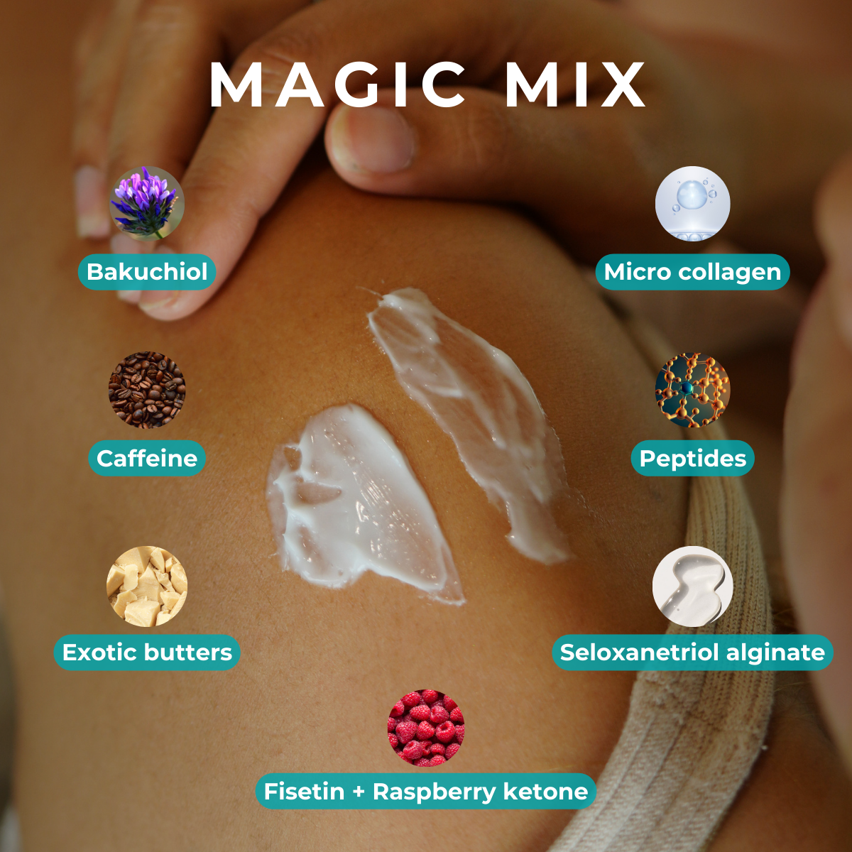 Ingredients: Aqua, 1,3-Propanediol, Glycerin, Caprylic/Capric Triglyceride, Coco- Caprylate, C15-19 Alkane, Cetearyl Alcohol, Cetyl Alcohol, Stearic Acid, ButyrospermumParkii (Shea) Butter, Sorbitan Stearate, Cetearyl Glucoside, Empetrum Nigrum Fruit Juice, Theobroma Cacao (Cocoa) Butter, Mangifera Indica (Mango) Seed Butter, Hydroxyethyl Acrylate/Sodium AcryloyldimethylTaurate Copolymer, Isohexadecane, Polysorbate 60, Ethylhexylglycerin, Phenoxyethanol, C10-30 Alkyl Acrylate Crosspolymer, Sodium Hydroxide, Disodium EDTA, Xanthan Gum, Psoralea corylifolia (Bakuchiol) seed oil, Collagen extract, Palmitoyl Tripeptide-5, Marrubium Vulgare Extract, Panthenol, Pantolactone, Sodium Benzoate, Potassium Sorbate, Fisetin, Raspberry Ketone, Cucumis Sativus (Cucumber) Fruit Extract, Siloxanetriol Alginate, Caffeine, Cocus Nucifera (Coconut) Oil, Tocopheryl Acetate, Centella Asiatica (Gotu Kola) Leaf Extract, Euterpe Oleracea (Acai) Fruit Extract, Sodium Cocoyl Amino Acid, Sarcosine, Potassium Aspartate, Magnesium, Dunaliella Salina Extract, Codium Tomentosum Extract, Zingiber Officinale (Ginger) Root Extract, Citrus Limon (Lemon) Peel Extract, Sodium Hyaluronate, Menthyl Lactate, PPG-26 – Buteth-26, PEG- 40 Hydrogenated Castor Oil, Mica, Fragrance