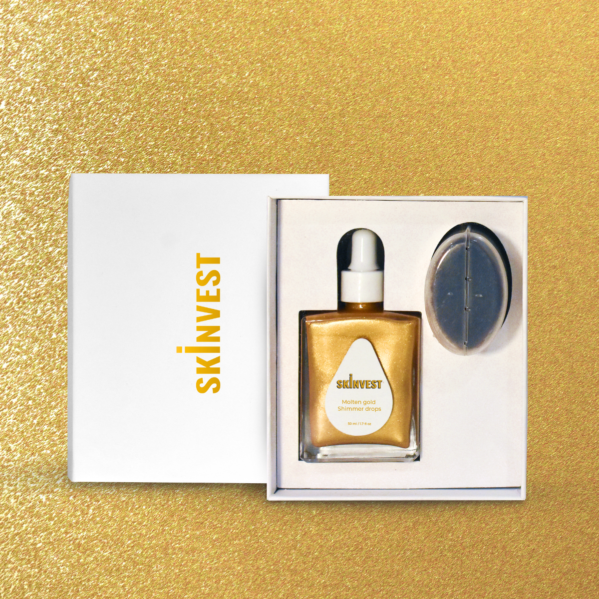 Skinvest Molten Gold Shimmer Body Oil Drops with Micro-Fine Champagne Shimmer & 10 Botanical Oils | Transfer Proof Glow, Deep Hydration, Non-Greasy | Free Luxe Buff Body Brush | 50ml