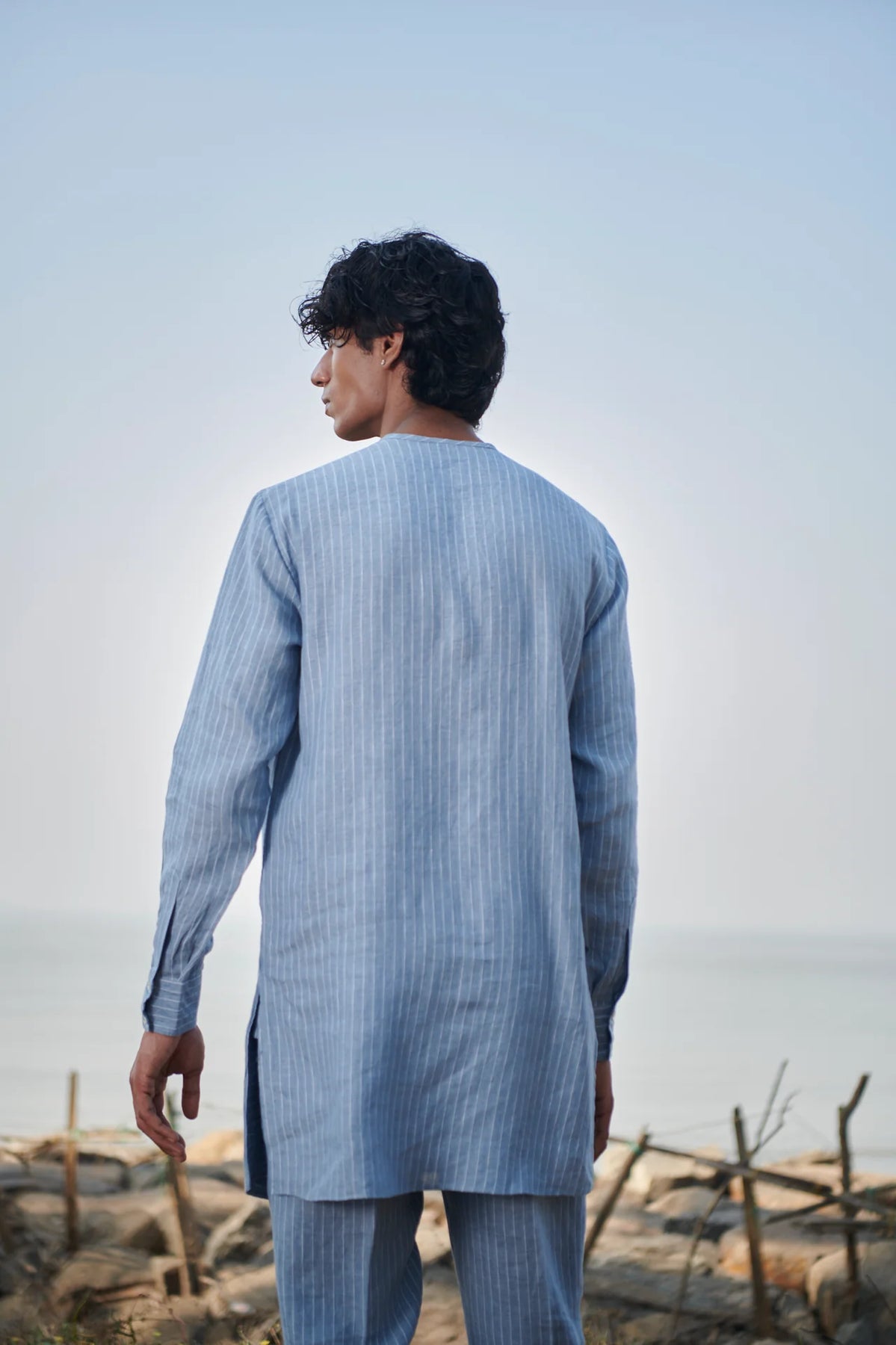 Crafted from 100% pure linen, this lightweight set pairs a side-opening kurta with pleated pyjama trousers — designed for comfort, structure, and softness in equal measure. The kurta features a round neck collar, mother-of-pearl buttons, and directional stripe detailing that flows into a distinctive angled placket. The pants are cut with a relaxed fit, front pleats, and a partially elasticated waistband — balancing ease with intention. Worn together, they offer a quiet uniform for warm days, festive moments, and everything in between.A traditional silhouette, thoughtfully updated for today.