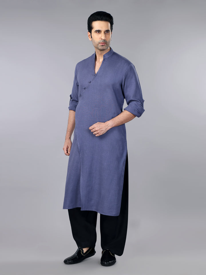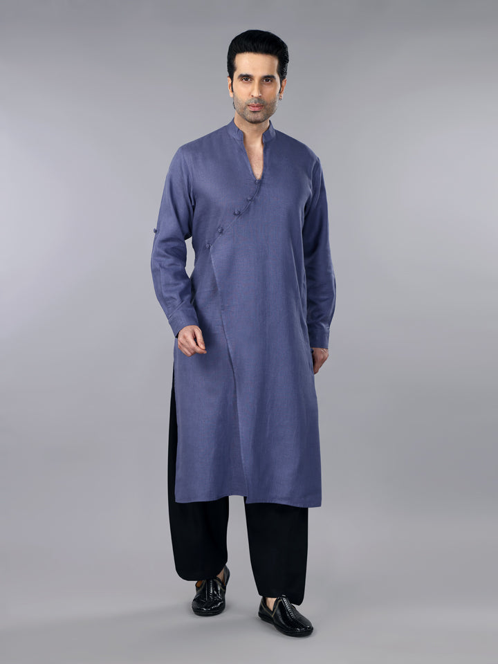 This slate grey pure linen overlap kurta and pleated salwar set is a seamless blend of traditional elegance and modern sophistication. The kurta showcases a unique overlap design, adorned with delicate fabric button detailing that adds an understated charm. Its band collar and long sleeves enhance the refined look, while the soft, breathable linen fabric ensures all-day comfort. The accompanying pleated salwar in classic black provides a perfect contrast, offering a relaxed fit that complements the kurta’s structured yet flowy silhouette. Together, this ensemble is an ideal choice for festive gatherings, cultural events, or casual occasions where effortless style is key. Complete the look with leather loafers or traditional juttis for a polished, timeless appeal.