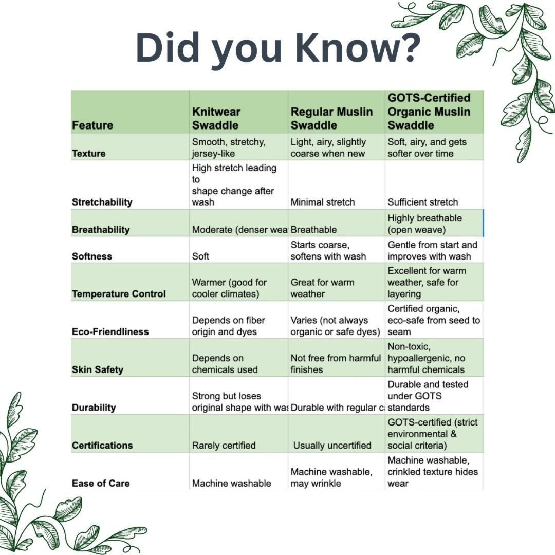 • Natural and Chemical-Free - Our organic cotton swaddles are GOTS certified, ensuring they’re free from harsh chemicals, toxins, and synthetic dyes. It’s safe enough for the most delicate newborn skin and a conscious choice for eco-minded parents.